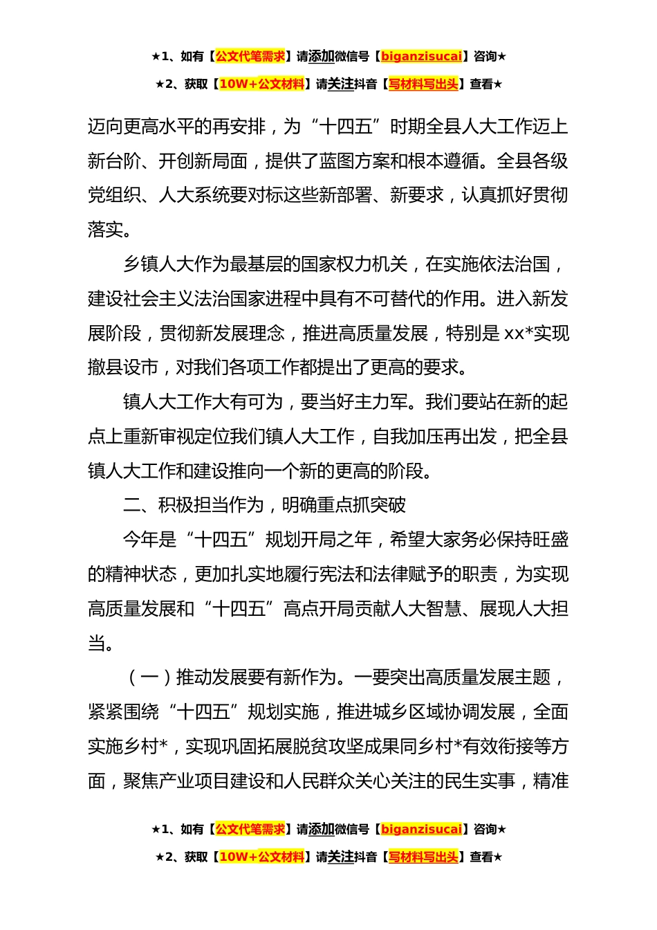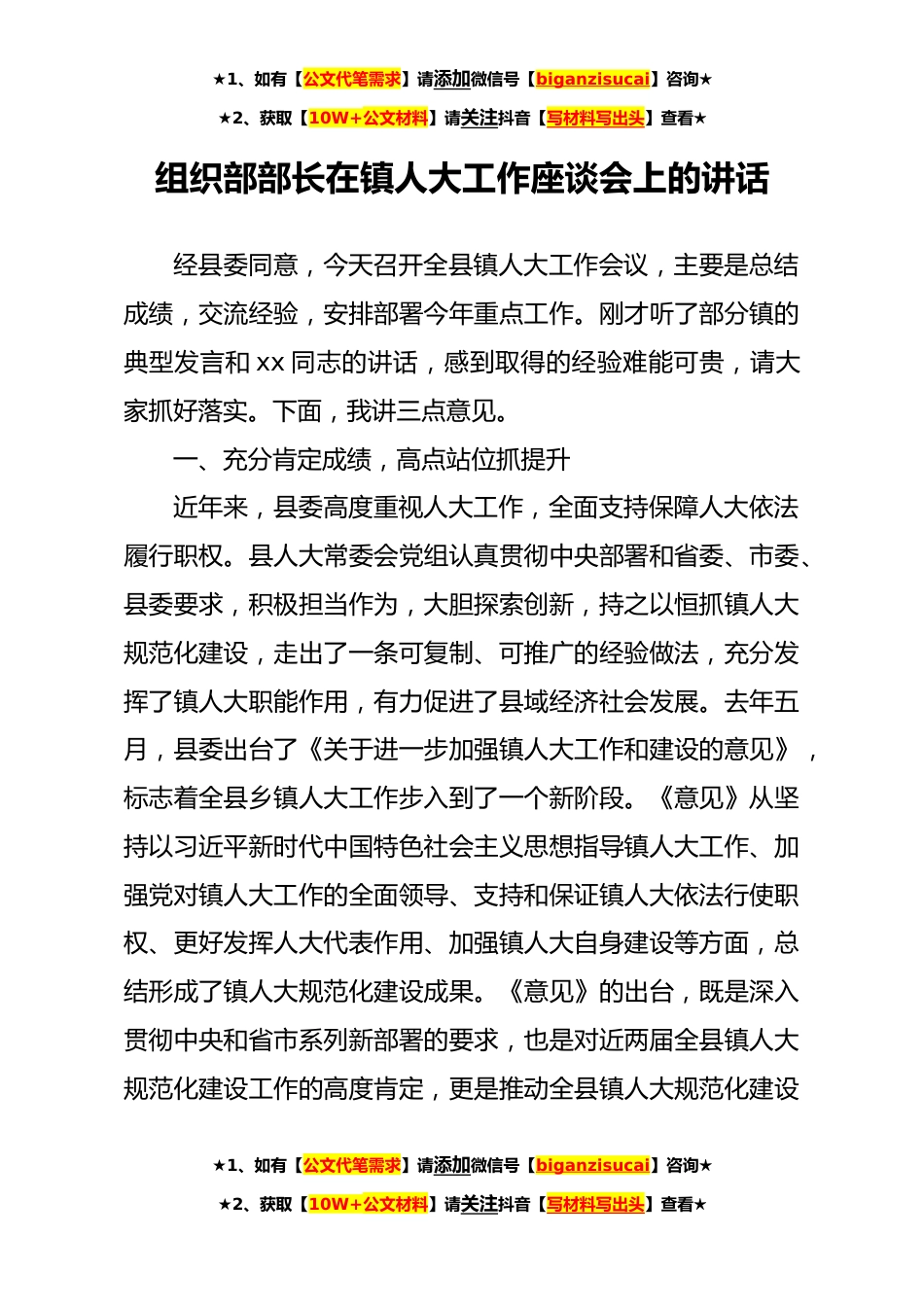 ★1、如有【公文代笔需求】请添加微信号【biganzisucai】咨询★★2、获取【10W+公文材料】请关注抖音【写材料写出头】查看★组织部部长在镇人大工作座谈会上的讲话经县委同意,今天召开全县镇人大工作会议,主要是总结成绩,交流经验,安排部署今年重点工作。刚才听了部分镇的典型发言和xx同志的讲话,感到取得的经验难能可贵,请大家抓好落实。下面,我讲三点意见。一、充分肯定成绩,高点站位抓提升近年来,县委高度重视人大工作,全面支持保障人大依法履行职权。县人大常委会党组认真贯彻中央部署和省委、市委、县委要求,积极担当作为,大胆探索创新,持之以恒抓镇人大规范化建设,走出了一条可复制、可推广的经验做法,充分发挥了镇人大职能作用,有力促进了县域经济社会发展。去年五月,县委出台了《关于进...