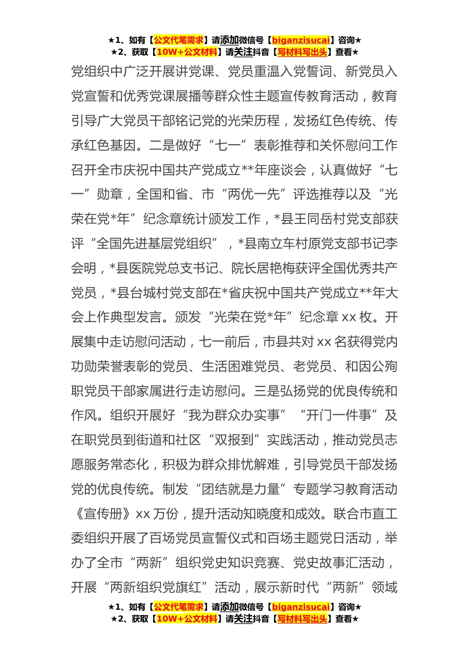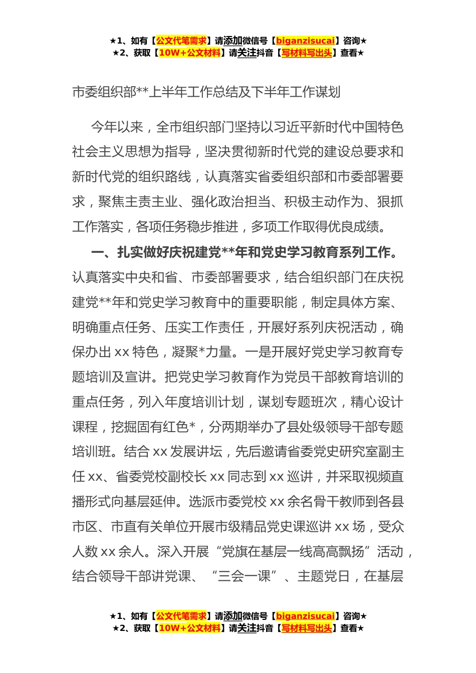 ★1、如有【公文代笔需求】请添加微信号【biganzisucai】咨询★★2、获取【10W+公文材料】请关注抖音【写材料写出头】查看★市委组织部**上半年工作总结及下半年工作谋划今年以来,全市组织部门坚持以习近平新时代中国特色社会主义思想为指导,坚决贯彻新时代党的建设总要求和新时代党的组织路线,认真落实省委组织部和市委部署要求,聚焦主责主业、强化政治担当、积极主动作为、狠抓工作落实,各项任务稳步推进,多项工作取得优良成绩。一、扎实做好庆祝建党**年和党史学习教育系列工作。认真落实中央和省、市委部署要求,结合组织部门在庆祝建党**年和党史学习教育中的重要职能,制定具体方案、明确重点任务、压实工作责任,开展好系列庆祝活动,确保办出xx特色,凝聚*力量。一是开展好党史学习教育专题培训及宣...