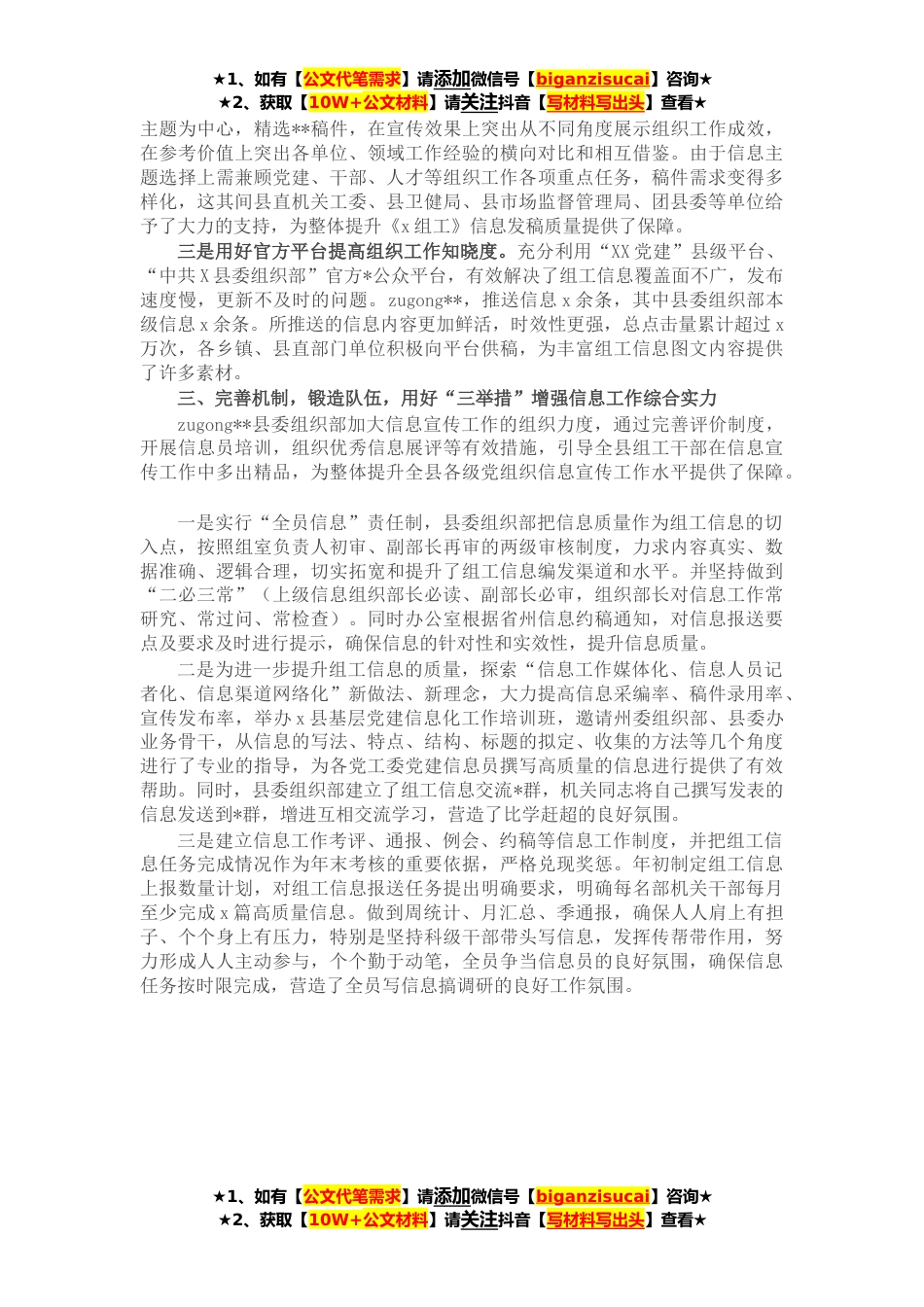 ★1、如有【公文代笔需求】请添加微信号【biganzisucai】咨询★★2、获取【10W+公文材料】请关注抖音【写材料写出头】查看★zugong**,X县认真贯彻落实新时代党的建设总要求和党的组织路线,紧紧围绕县委中心工作和组织工作重点任务,笔耕不辍,坚持记录全县组织系统亮点工作,提炼总结实践工作中的经验做法,为全面推进我县组织工作的提档升级,努力开创新时代党的建设和组织工作新局面发挥了重要作用。一年来,在州委组织部的坚强领导下,在全县各级党组织和广大党员干部人才的共同努力下,全年县本级信息载体编发稿件X多篇,XX组工网采用x条次,XX组工、XX日报、XX头条以及*网、乡村干部报等等平台、网站、报刊采用x多条次,保持了*组织系统信息宣传工作的靠前位次。一、围绕中心,突出主题,用好“三面镜”丰...