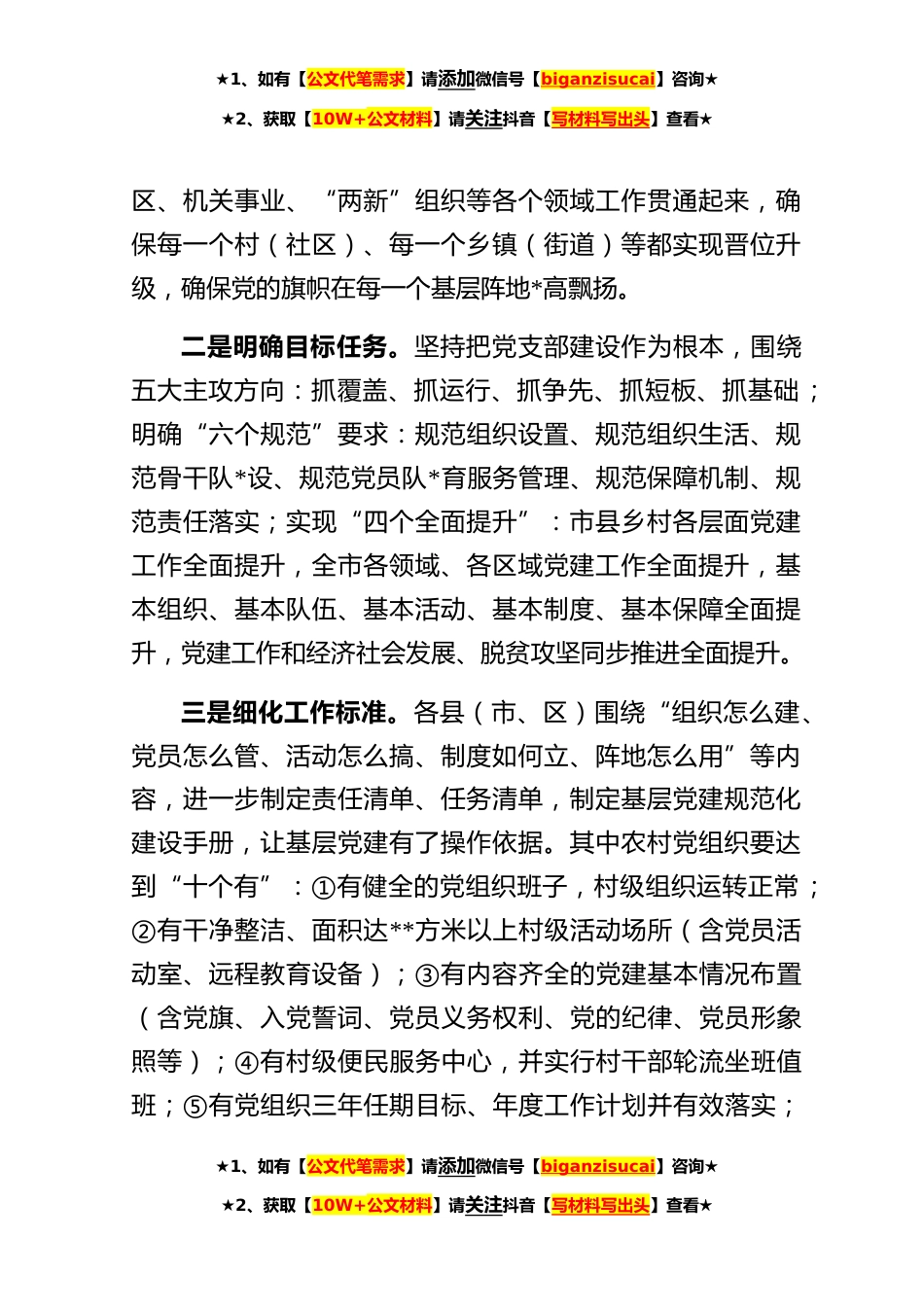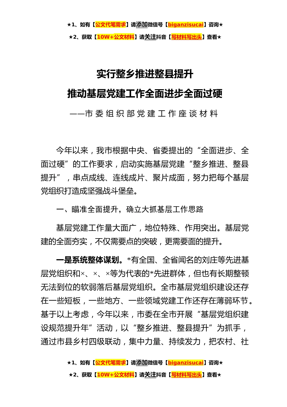 ★1、如有【公文代笔需求】请添加微信号【biganzisucai】咨询★★2、获取【10W+公文材料】请关注抖音【写材料写出头】查看★实行整乡推进整县提升推动基层党建工作全面进步全面过硬——市委组织部党建工作座谈材料今年以来,我市根据中央、省委提出的“全面进步、全面过硬”的工作要求,启动实施基层党建“整乡推进、整县提升”,串点成线、连线成片、聚片成面,努力把每个基层党组织打造成坚强战斗堡垒。一、瞄准全面提升,确立大抓基层工作思路基层党建工作量大面广,地位特殊、作用突出。基层党建的全面夯实,不仅需要点的突破,更需要面的提升。一是系统整体谋划。*有全国、全省闻名的刘庄等先进基层党组织和×、×、×等为代表的*先进群体,但也有长期整顿无法到位的软弱落后基层党组织。全市基层党组织建设...