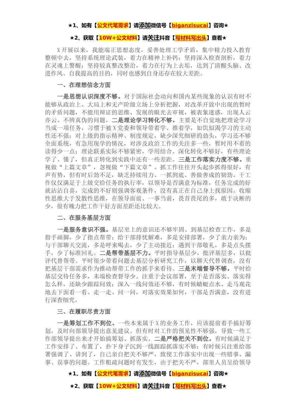 ★1、如有【公文代笔需求】请添加微信号【biganzisucai】咨询★★2、获取【10W+公文材料】请关注抖音【写材料写出头】查看★X开展以来,我能端正思想态度,妥善处理工学矛盾,集中精力投入教育整顿中去,坚持系统理论武装,着力在精神上补钙;坚持深入检查剖析,着力在灵魂上警醒;坚持较真整改整治,着力在行为上去垢,达到了清醒头脑、改进作风、自我提高的目的,同时也感到自身还存在较大差距。一、在理想信念方面一是思想认识深度不够。对于国际社会动向和国内某些现象的认识有时不能够从政治上、大局上和无产阶级立场上分析把握,对改革开放中出现的暂时的矛盾问题,不能用辩证的思维、发展的眼光去审视,被表象迷惑,出现人云亦云、不辨真伪的问题。二是理论学习转化不够。主要是不自觉地把理论学习当成一项...