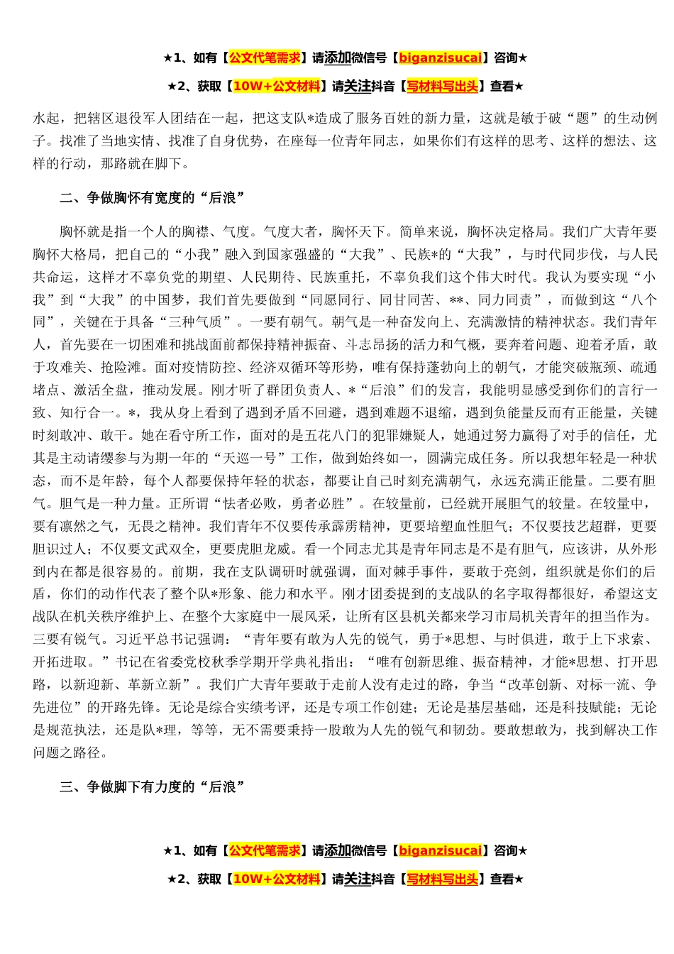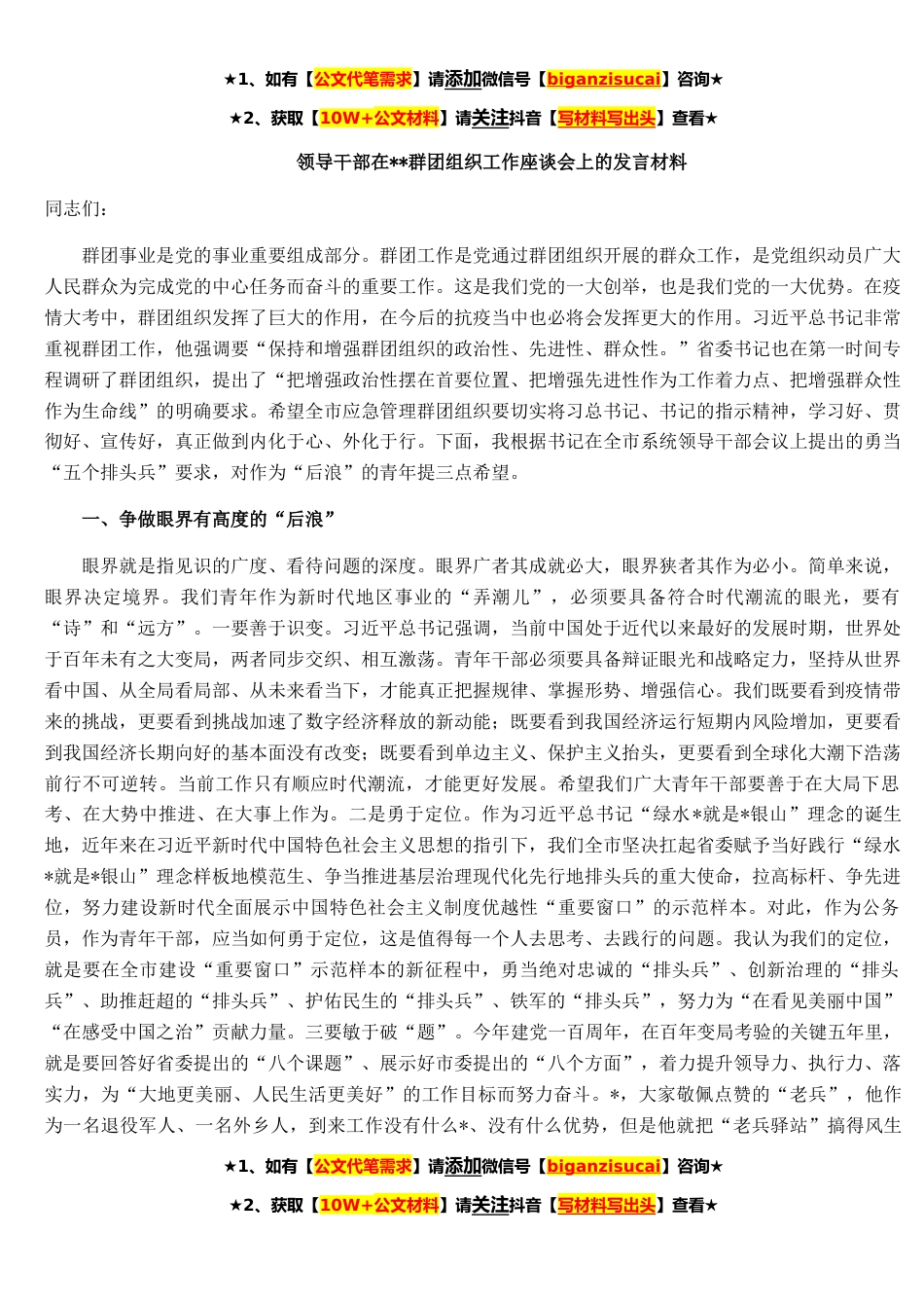 ★1、如有【公文代笔需求】请添加微信号【biganzisucai】咨询★★2、获取【10W+公文材料】请关注抖音【写材料写出头】查看★领导干部在**群团组织工作座谈会上的发言材料同志们:群团事业是党的事业重要组成部分。群团工作是党通过群团组织开展的群众工作,是党组织动员广大人民群众为完成党的中心任务而奋斗的重要工作。这是我们党的一大创举,也是我们党的一大优势。在疫情大考中,群团组织发挥了巨大的作用,在今后的抗疫当中也必将会发挥更大的作用。习近平总书记非常重视群团工作,他强调要“保持和增强群团组织的政治性、先进性、群众性。”省委书记也在第一时间专程调研了群团组织,提出了“把增强政治性摆在首要位置、把增强先进性作为工作着力点、把增强群众性作为生命线”的明确要求。希望全市应急管理...