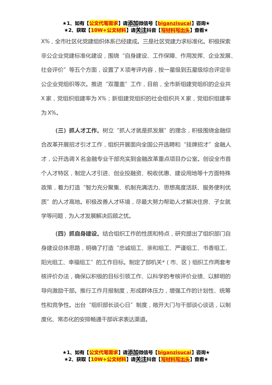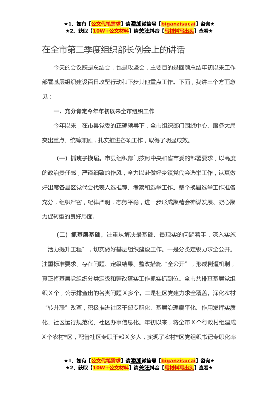 ★1、如有【公文代笔需求】请添加微信号【biganzisucai】咨询★★2、获取【10W+公文材料】请关注抖音【写材料写出头】查看★在全市第二季度组织部长例会上的讲话今天的会议既是总结会,也是攻坚会,主要目的是回顾总结年初以来工作部署基层组织建设百日攻坚行动和下步其他重点工作。下面,我讲三个方面意见:一、充分肯定今年年初以来全市组织工作今年以来,在市县党委的正确领导下,全市组织部门围绕中心、服务大局突出重点、统筹兼顾,扎实推进各项工作,取得了明显成效。(一)抓班子换届。市县组织部门按照中央和省市委的部署要求,以高度的政治责任感,严谨细致的作风,全力以赴做好乡镇党代会选举工作,认真做好出席各县区党代会代表人选推荐、考察和选举工作。整个换届选举工作准备充分,组织严密,纪律严...