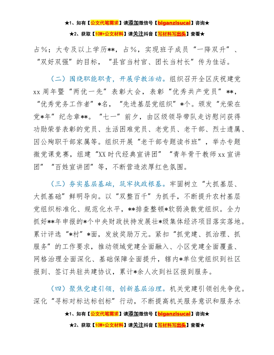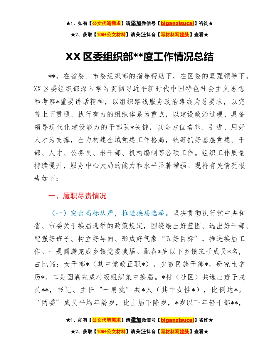 ★1、如有【公文代笔需求】请添加微信号【biganzisucai】咨询★★2、获取【10W+公文材料】请关注抖音【写材料写出头】查看★XX区委组织部**度工作情况总结**,在省委、市委组织部的指导帮助下,在区委的坚强领导下,XX区委组织部深入学习贯彻习近平新时代中国特色社会主义思想和考察*重要讲话精神,以组织路线服务政治路线为总要求,以完善上下贯通、执行有力的组织体系为重点,以建设政治过硬、具备领导现代化建设能力的干部队*关键,以全方位培养、引进、用好人才为支撑,全力构建全域党建工作格局,统筹抓好基层党建、干部、人才、公务员、老干部、机构编制等各项工作。组织工作质量持续提升,服务中心大局的能力和水平显著增强。现将有关情况报告如下:一、履职尽责情况(一)突出高标从严,推进换届选举。坚...