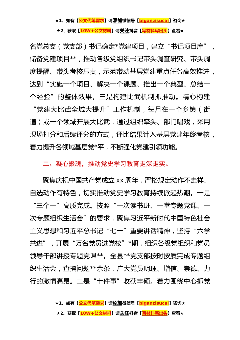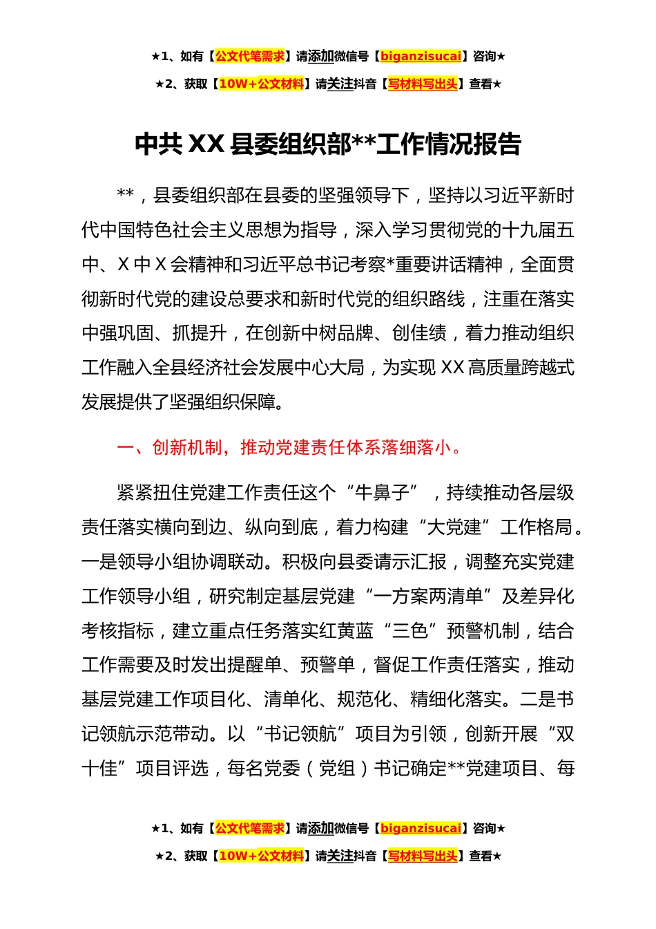 ★1、如有【公文代笔需求】请添加微信号【biganzisucai】咨询★★2、获取【10W+公文材料】请关注抖音【写材料写出头】查看★中共XX县委组织部**工作情况报告**,县委组织部在县委的坚强领导下,坚持以习近平新时代中国特色社会主义思想为指导,深入学习贯彻党的十九届五中、X中X会精神和习近平总书记考察*重要讲话精神,全面贯彻新时代党的建设总要求和新时代党的组织路线,注重在落实中强巩固、抓提升,在创新中树品牌、创佳绩,着力推动组织工作融入全县经济社会发展中心大局,为实现XX高质量跨越式发展提供了坚强组织保障。一、创新机制,推动党建责任体系落细落小。紧紧扭住党建工作责任这个“牛鼻子”,持续推动各层级责任落实横向到边、纵向到底,着力构建“大党建”工作格局。一是领导小组协调联动。积极向...