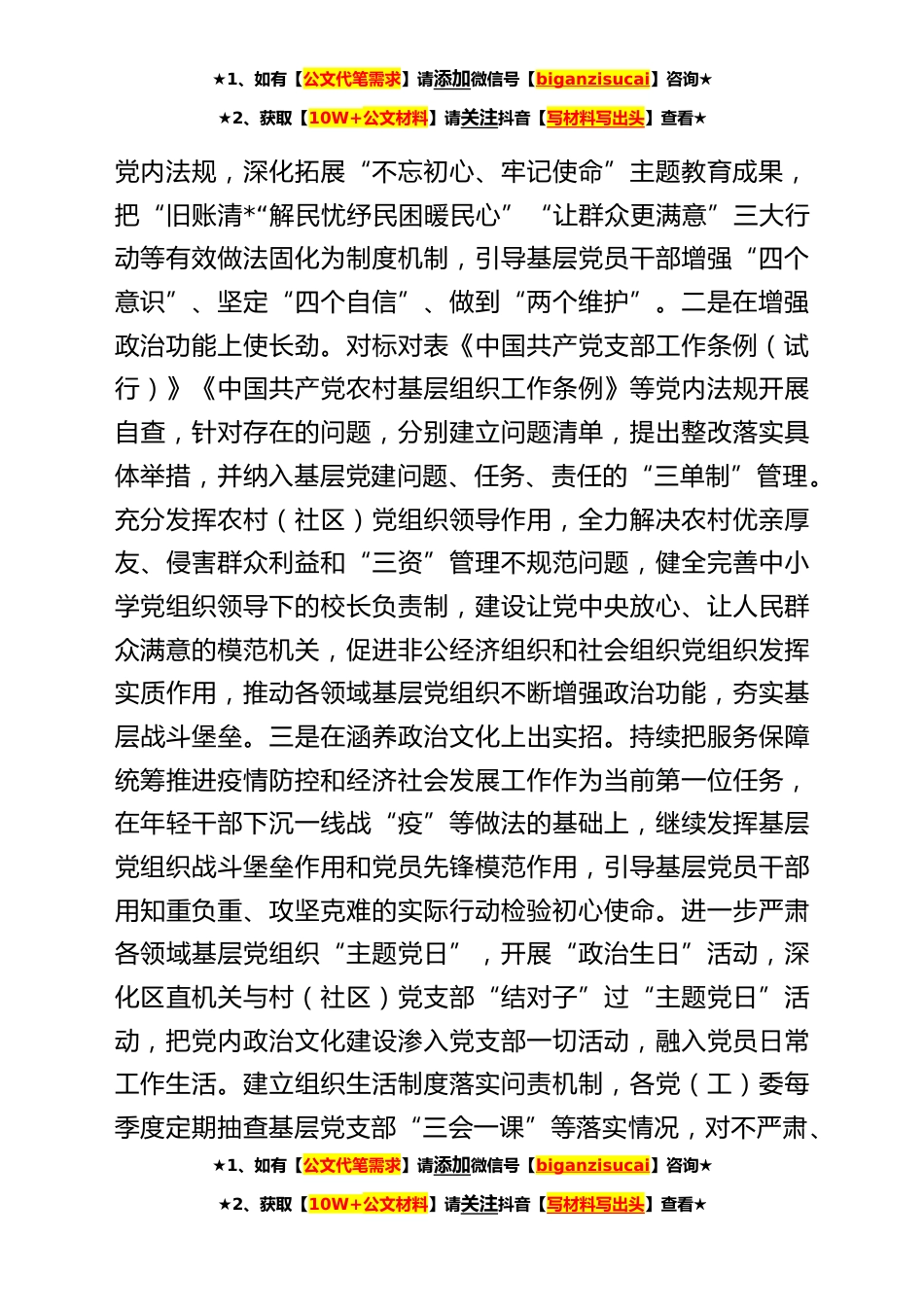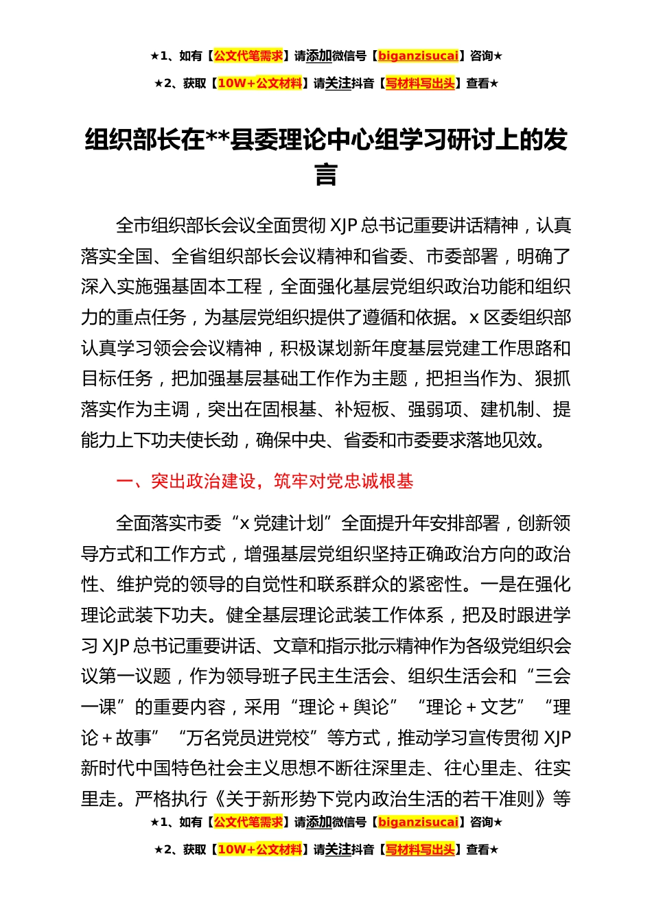 ★1、如有【公文代笔需求】请添加微信号【biganzisucai】咨询★★2、获取【10W+公文材料】请关注抖音【写材料写出头】查看★组织部长在**县委理论中心组学习研讨上的发言全市组织部长会议全面贯彻XJP总书记重要讲话精神,认真落实全国、全省组织部长会议精神和省委、市委部署,明确了深入实施强基固本工程,全面强化基层党组织政治功能和组织力的重点任务,为基层党组织提供了遵循和依据。x区委组织部认真学习领会会议精神,积极谋划新年度基层党建工作思路和目标任务,把加强基层基础工作作为主题,把担当作为、狠抓落实作为主调,突出在固根基、补短板、强弱项、建机制、提能力上下功夫使长劲,确保中央、省委和市委要求落地见效。一、突出政治建设,筑牢对党忠诚根基全面落实市委“x党建计划”全面提升年安排部...