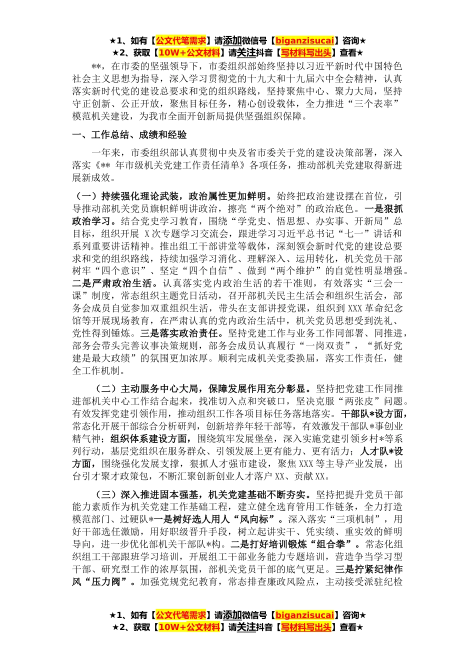 ★1、如有【公文代笔需求】请添加微信号【biganzisucai】咨询★★2、获取【10W+公文材料】请关注抖音【写材料写出头】查看★**,在市委的坚强领导下,市委组织部始终坚持以习近平新时代中国特色社会主义思想为指导,深入学习贯彻党的十九大和十九届六中全会精神,认真落实新时代党的建设总要求和党的组织路线,坚持聚焦中心、聚力大局,坚持守正创新、公正开放,聚焦目标任务,精心创设载体,全力推进“三个表率”模范机关建设,为我市全面开创新局提供坚强组织保障。一、工作总结、成绩和经验一年来,市委组织部认真贯彻中央及省市委关于党的建设决策部署,深入落实《**年市级机关党建工作责任清单》各项任务,推动部机关党建取得新进展新成效。(一)持续强化理论武装,政治属性更加鲜明。始终把政治建设摆在首...