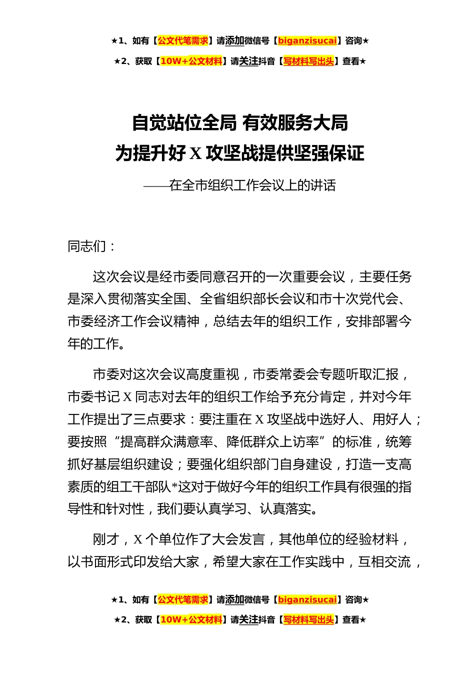 ★1、如有【公文代笔需求】请添加微信号【biganzisucai】咨询★★2、获取【10W+公文材料】请关注抖音【写材料写出头】查看★自觉站位全局有效服务大局为提升好X攻坚战提供坚强保证——在全市组织工作会议上的讲话同志们:这次会议是经市委同意召开的一次重要会议,主要任务是深入贯彻落实全国、全省组织部长会议和市十次党代会、市委经济工作会议精神,总结去年的组织工作,安排部署今年的工作。市委对这次会议高度重视,市委常委会专题听取汇报,市委书记X同志对去年的组织工作给予充分肯定,并对今年工作提出了三点要求:要注重在X攻坚战中选好人、用好人;要按照“提高群众满意率、降低群众上访率”的标准,统筹抓好基层组织建设;要强化组织部门自身建设,打造一支高素质的组工干部队*这对于做好今年的组织工...