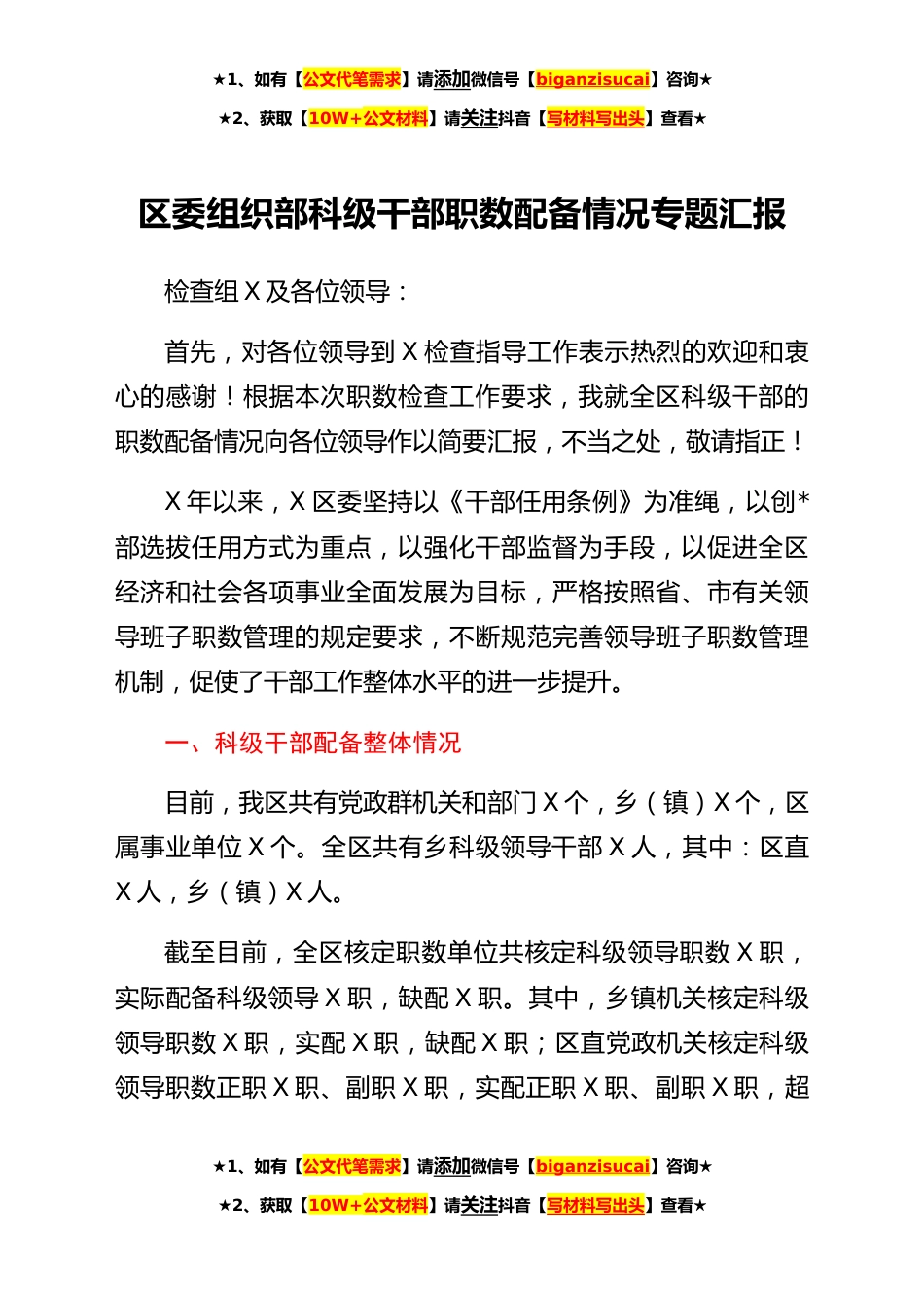 ★1、如有【公文代笔需求】请添加微信号【biganzisucai】咨询★★2、获取【10W+公文材料】请关注抖音【写材料写出头】查看★区委组织部科级干部职数配备情况专题汇报检查组X及各位领导:首先,对各位领导到X检查指导工作表示热烈的欢迎和衷心的感谢!根据本次职数检查工作要求,我就全区科级干部的职数配备情况向各位领导作以简要汇报,不当之处,敬请指正!X年以来,X区委坚持以《干部任用条例》为准绳,以创*部选拔任用方式为重点,以强化干部监督为手段,以促进全区经济和社会各项事业全面发展为目标,严格按照省、市有关领导班子职数管理的规定要求,不断规范完善领导班子职数管理机制,促使了干部工作整体水平的进一步提升。一、科级干部配备整体情况目前,我区共有党政群机关和部门X个,乡(镇)X个,区属事...