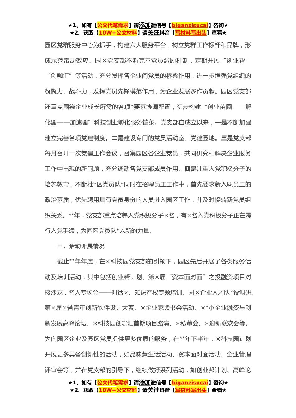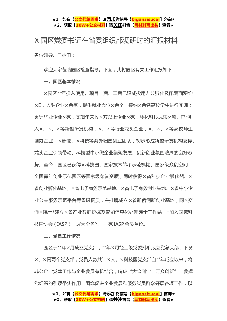 ★1、如有【公文代笔需求】请添加微信号【biganzisucai】咨询★★2、获取【10W+公文材料】请关注抖音【写材料写出头】查看★X园区党委书记在省委组织部调研时的汇报材料各位领导、同志们:欢迎大家莅临园区检查指导。下面,我将园区有关工作汇报如下:一、园区基本情况×园区**年投入使用。项目一期、二期已建成投用办公孵化及配套面积约×㎡,入驻企业×余家,提供就业岗位×余个,接纳×余名高校学生进行实训;累计毕业企业×家,实现年营收×万以上企业×家,转化科技成果×项。已*引入×、×、×等新型研发机构,×、×等行业龙头企业,×、×、×等高校师生创办企业,×影像、×科技等海外归国创业团队,初步形成新型研发机构支撑、龙头企业引领带动、科技型中小微企业集聚发展、创新创业氛围浓厚的良好态势...