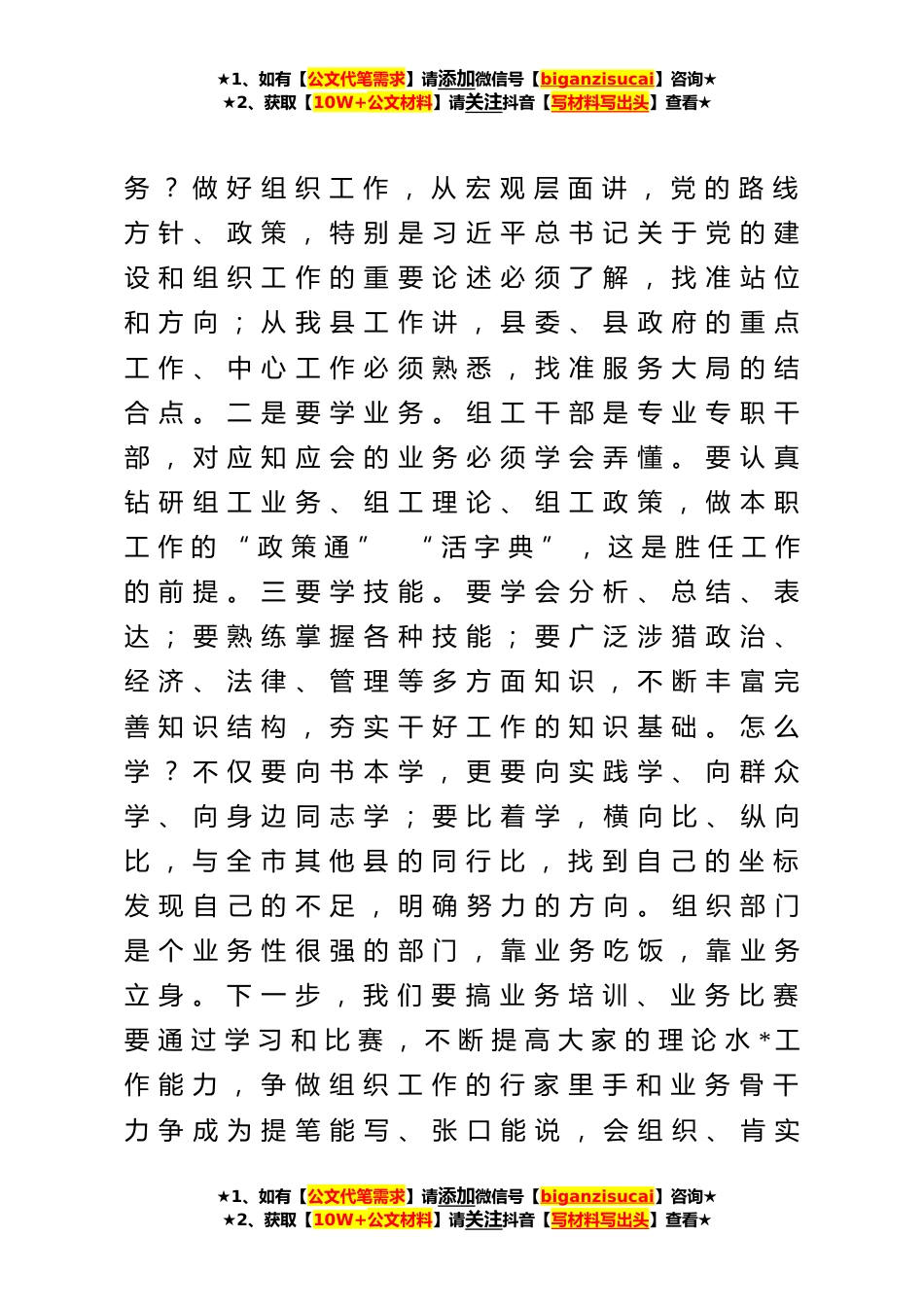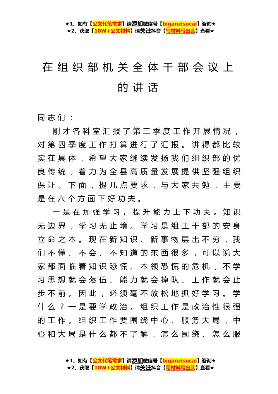 ★1、如有【公文代笔需求】请添加微信号【biganzisucai】咨询★★2、获取【10W+公文材料】请关注抖音【写材料写出头】查看★在组织部机关全体干部会议上的讲话同志们:刚才各科室汇报了第三季度工作开展情况,对第四季度工作打算进行了汇报。讲得都比较实在具体,希望大家继续发扬我们组织部的优良传统,着力为全县高质量发展提供坚强组织保证。下面,提几点要求,与大家共勉,主要是在六个方面下好功夫。一是在加强学习,提升能力上下功夫。知识无边界,学习无止境。学习是组工干部的安身立命之本。现在新知识、新事物层出不穷,我们不懂、不会、不知道的东西很多,可以说大家都面临着知识恐慌、本领恐慌的危机,不学习思想就会落伍、能力就会掉队、工作就会止步不前。因此,必须毫不放松地抓好学习。学什么?一...