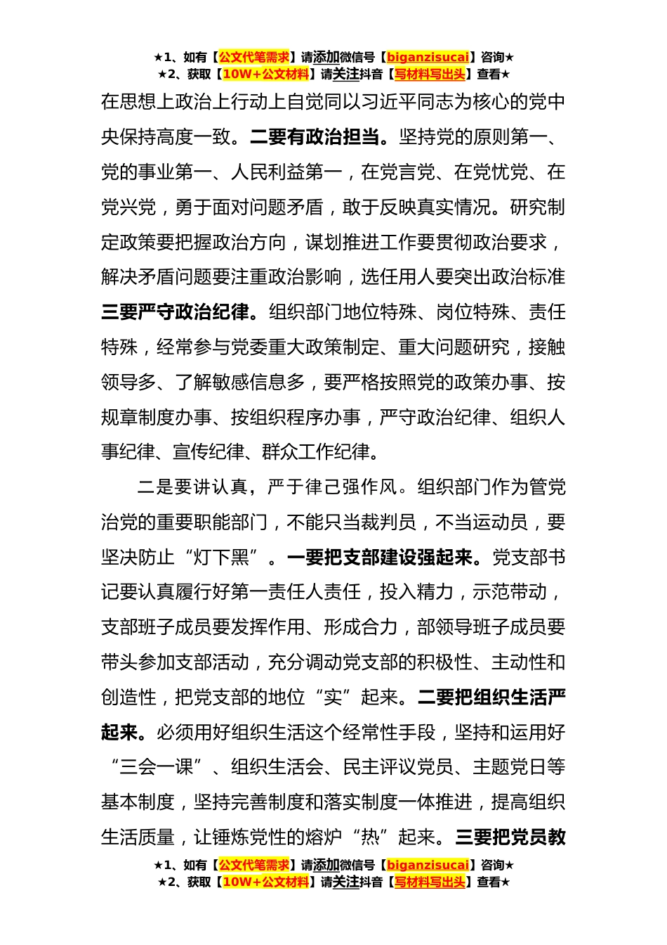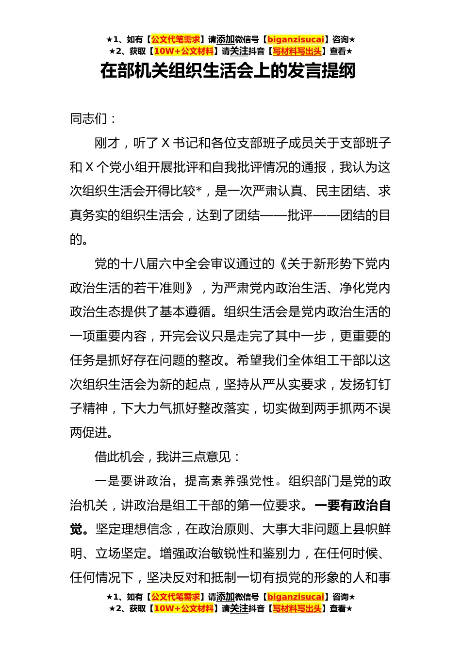 ★1、如有【公文代笔需求】请添加微信号【biganzisucai】咨询★★2、获取【10W+公文材料】请关注抖音【写材料写出头】查看★在部机关组织生活会上的发言提纲同志们:刚才,听了X书记和各位支部班子成员关于支部班子和X个党小组开展批评和自我批评情况的通报,我认为这次组织生活会开得比较*,是一次严肃认真、民主团结、求真务实的组织生活会,达到了团结——批评——团结的目的。党的十八届六中全会审议通过的《关于新形势下党内政治生活的若干准则》,为严肃党内政治生活、净化党内政治生态提供了基本遵循。组织生活会是党内政治生活的一项重要内容,开完会议只是走完了其中一步,更重要的任务是抓好存在问题的整改。希望我们全体组工干部以这次组织生活会为新的起点,坚持从严从实要求,发扬钉钉子精神,下大力...