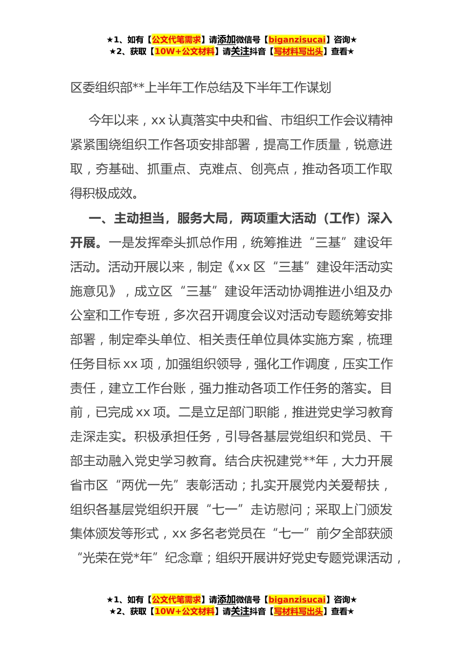 ★1、如有【公文代笔需求】请添加微信号【biganzisucai】咨询★★2、获取【10W+公文材料】请关注抖音【写材料写出头】查看★区委组织部**上半年工作总结及下半年工作谋划今年以来,xx认真落实中央和省、市组织工作会议精神紧紧围绕组织工作各项安排部署,提高工作质量,锐意进取,夯基础、抓重点、克难点、创亮点,推动各项工作取得积极成效。一、主动担当,服务大局,两项重大活动(工作)深入开展。一是发挥牵头抓总作用,统筹推进“三基”建设年活动。活动开展以来,制定《xx区“三基”建设年活动实施意见》,成立区“三基”建设年活动协调推进小组及办公室和工作专班,多次召开调度会议对活动专题统筹安排部署,制定牵头单位、相关责任单位具体实施方案,梳理任务目标xx项,加强组织领导,强化工作调度,压实...