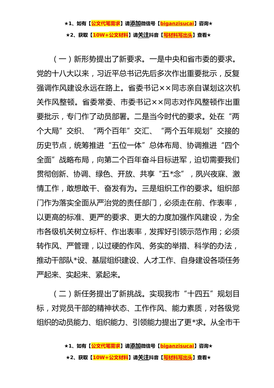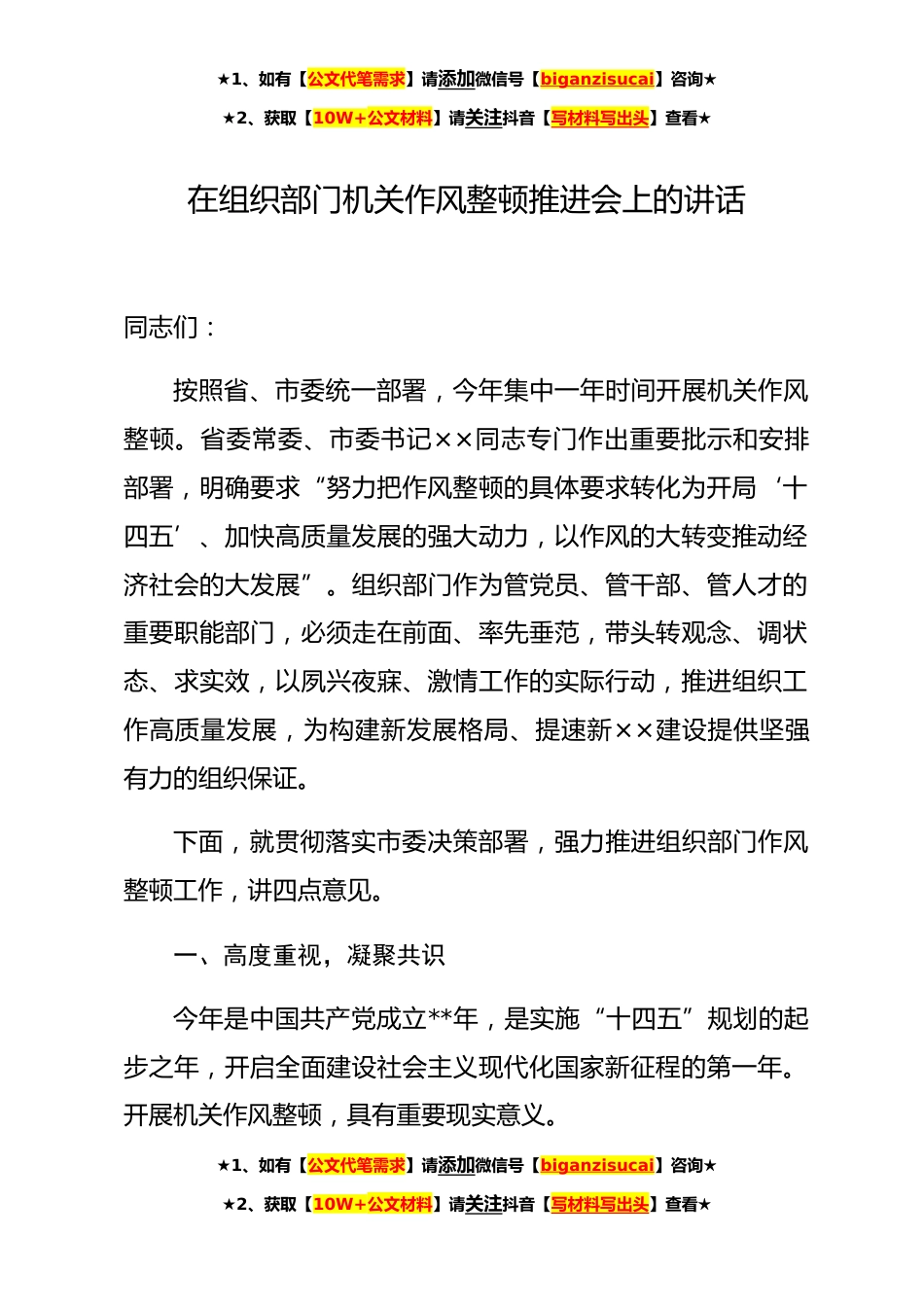 ★1、如有【公文代笔需求】请添加微信号【biganzisucai】咨询★★2、获取【10W+公文材料】请关注抖音【写材料写出头】查看★在组织部门机关作风整顿推进会上的讲话同志们:按照省、市委统一部署,今年集中一年时间开展机关作风整顿。省委常委、市委书记××同志专门作出重要批示和安排部署,明确要求“努力把作风整顿的具体要求转化为开局‘十四五’、加快高质量发展的强大动力,以作风的大转变推动经济社会的大发展”。组织部门作为管党员、管干部、管人才的重要职能部门,必须走在前面、率先垂范,带头转观念、调状态、求实效,以夙兴夜寐、激情工作的实际行动,推进组织工作高质量发展,为构建新发展格局、提速新××建设提供坚强有力的组织保证。下面,就贯彻落实市委决策部署,强力推进组织部门作风整顿工作...