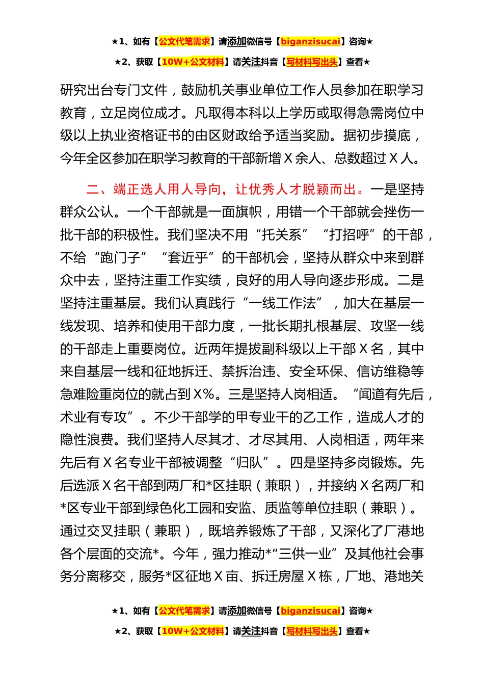 ★1、如有【公文代笔需求】请添加微信号【biganzisucai】咨询★★2、获取【10W+公文材料】请关注抖音【写材料写出头】查看★区委组织部干部教育管理交流发言材料事业发展,成在干部队伍,败也在干部队*党风政风,誉在干部队伍,毁也在干部队*X区国土面积小、干部基数少,但产业发展、厂港服务、安全环保、城乡融合等任务十分繁重,必须有一支特别讲担当、特别敢作为、特别能战斗的干部队*近年来尤其是党的十九大以来,X区委认真贯彻落实新时代党的组织路线和市委“一三五”基本思路,打好干部教育培训、选拔任用、考核评价、管理监督“组合拳”,进一步调动广大干部的积极性、主动性和创造性,推动厂港地融合发展和各项事业进步。一、拓展教育培训途径,将能力建设牢牢抓住。一是强化党性炼。围绕“学、思、践、悟...
