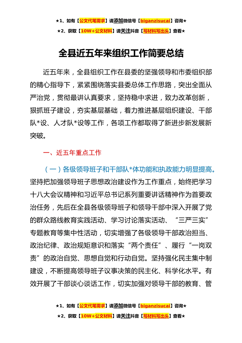 ★1、如有【公文代笔需求】请添加微信号【biganzisucai】咨询★★2、获取【10W+公文材料】请关注抖音【写材料写出头】查看★全县近五年来组织工作简要总结近五年来,全县组织工作在县委的坚强领导和市委组织部的精心指导下,紧紧围绕落实县委总体工作思路,突出全面从严治党,贯彻最讲认真要求,坚持稳中求进,致力改革创新,狠抓班子建设,夯实基层基础,着力推进基层组织建设、干部队*设、人才队*设等工作,各项工作都取得了新进步新发展新突破。一、近五年重点工作(一)各级领导班子和干部队*体功能和执政能力明显提高。坚持把加强领导班子思想政治建设作为工作重点,始终把学习十八大会议精神和习近平总书记系列重要讲话精神作为首要政治任务,先后在全县各级领导班子和领导干部中深入开展了党的群众路线教育...