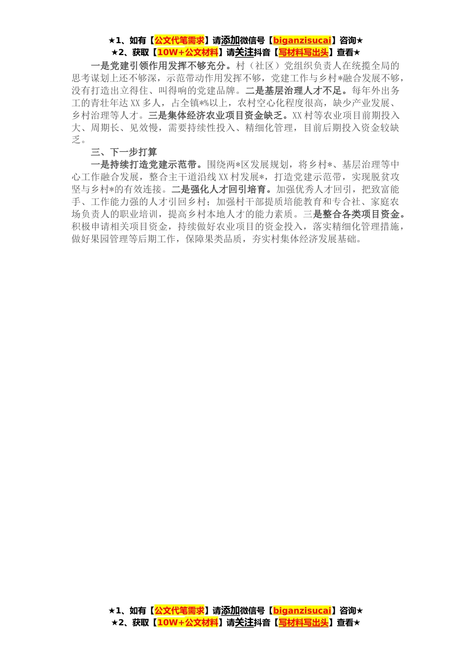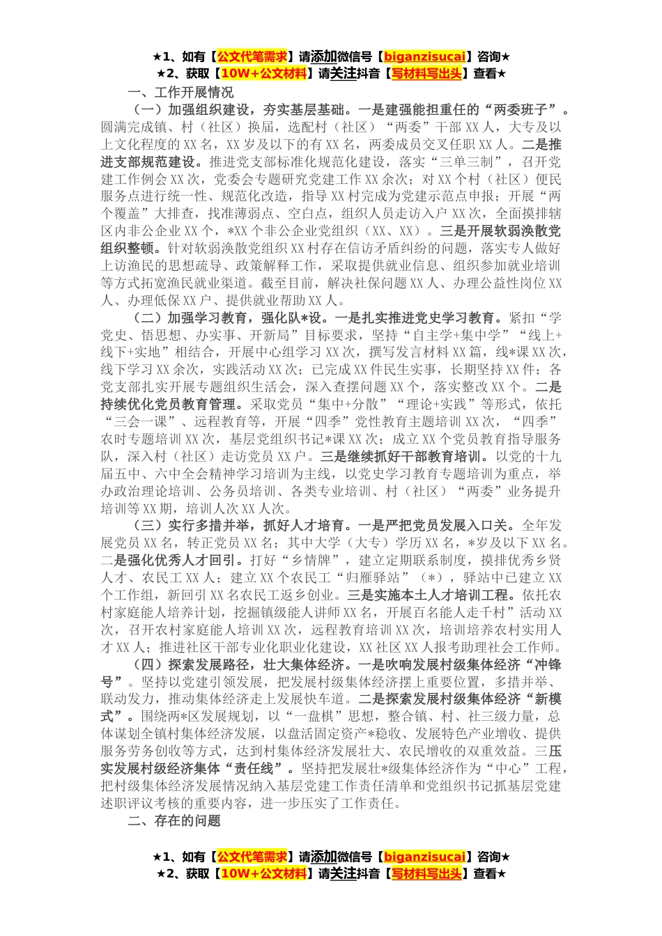 ★1、如有【公文代笔需求】请添加微信号【biganzisucai】咨询★★2、获取【10W+公文材料】请关注抖音【写材料写出头】查看★一、工作开展情况(一)加强组织建设,夯实基层基础。一是建强能担重任的“两委班子”。圆满完成镇、村(社区)换届,选配村(社区)“两委”干部XX人,大专及以上文化程度的XX名,XX岁及以下的有XX名,两委成员交叉任职XX人。二是推进支部规范建设。推进党支部标准化规范化建设,落实“三单三制”,召开党建工作例会XX次,党委会专题研究党建工作XX余次;对XX个村(社区)便民服务点进行统一性、规范化改造,指导XX村完成为党建示范点申报;开展“两个覆盖”大排查,找准薄弱点、空白点,组织人员走访入户XX次,全面摸排辖区内非公企业XX个,*XX个非公企业党组织(XX、XX)。三是开展软弱...