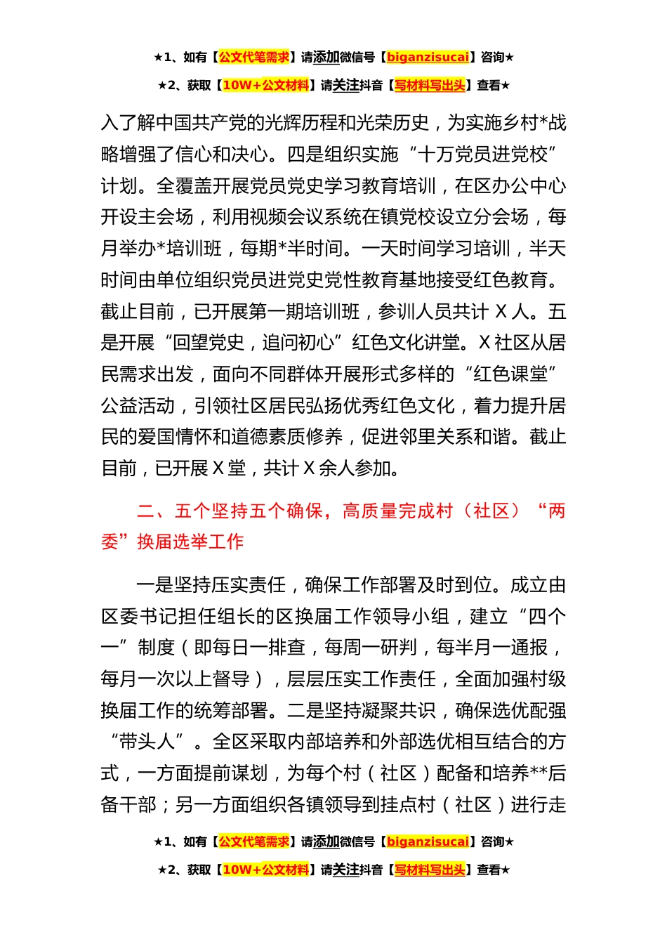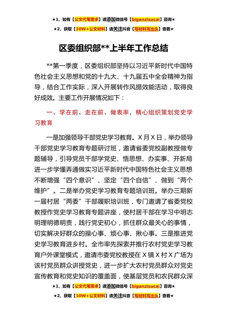 ★1、如有【公文代笔需求】请添加微信号【biganzisucai】咨询★★2、获取【10W+公文材料】请关注抖音【写材料写出头】查看★区委组织部**上半年工作总结**第一季度,区委组织部坚持以习近平新时代中国特色社会主义思想和党的十九大、十九届五中全会精神为指导,结合工作实际,深入开展转作风提效能活动,取得良好成效。主要工作开展情况如下:一、学在前、走在前、做表率,精心组织策划党史学习教育一是加强领导干部党史学习教育。X月X日,举办领导干部党史学习教育专题研讨班,邀请省委党校副教授做专题辅导,引导党员干部学党史、悟思想、办实事、开新局进一步学懂弄通做实习近平新时代中国特色社会主义思想不断增强“四个意识”、坚定“四个自信”、做到“两个维护”。二是举办党史学习教育专题培训班。举办三...