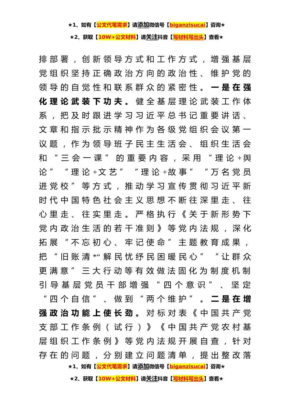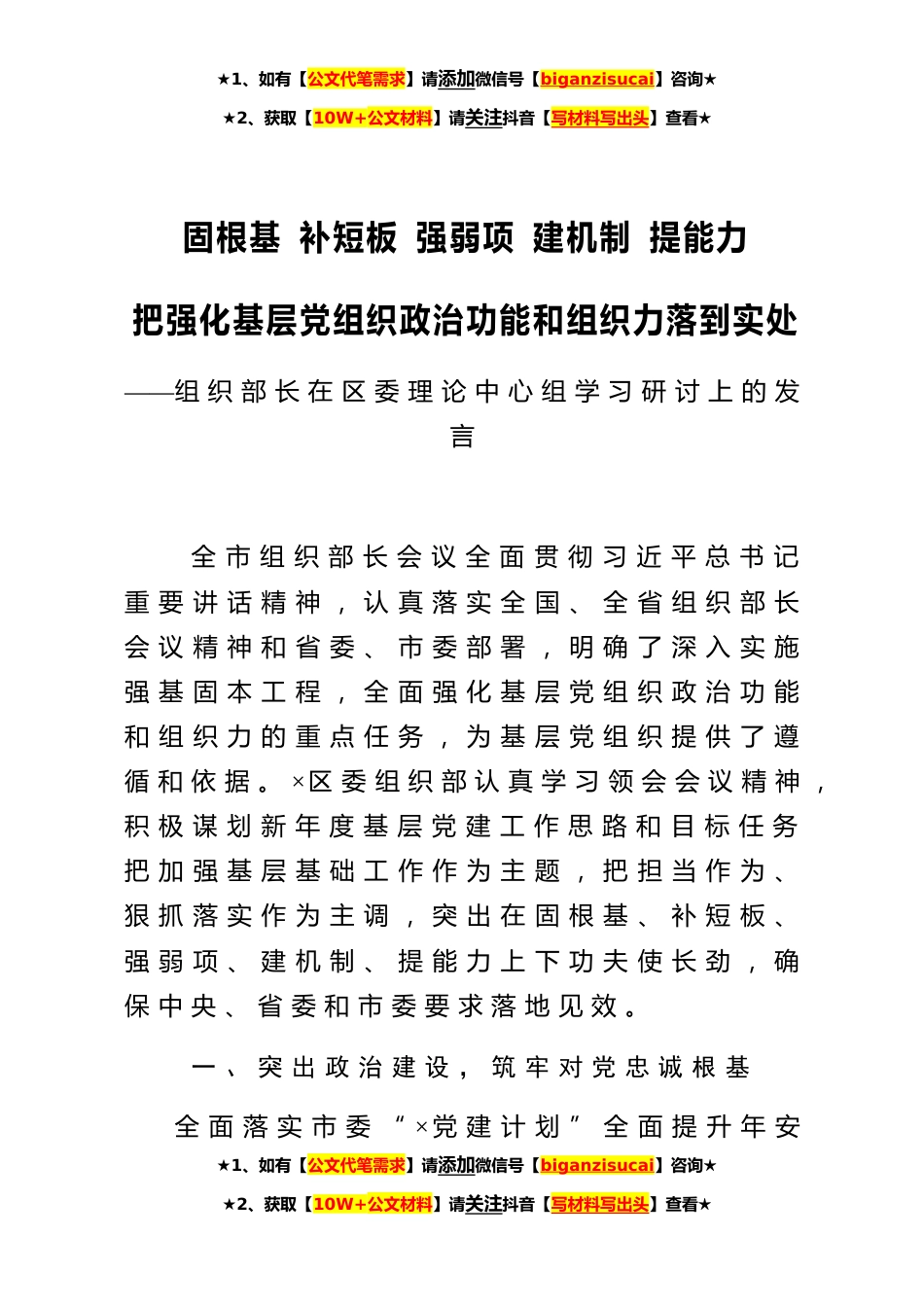 ★1、如有【公文代笔需求】请添加微信号【biganzisucai】咨询★★2、获取【10W+公文材料】请关注抖音【写材料写出头】查看★固根基补短板强弱项建机制提能力把强化基层党组织政治功能和组织力落到实处——组织部长在区委理论中心组学习研讨上的发言全市组织部长会议全面贯彻习近平总书记重要讲话精神,认真落实全国、全省组织部长会议精神和省委、市委部署,明确了深入实施强基固本工程,全面强化基层党组织政治功能和组织力的重点任务,为基层党组织提供了遵循和依据。×区委组织部认真学习领会会议精神,积极谋划新年度基层党建工作思路和目标任务把加强基层基础工作作为主题,把担当作为、狠抓落实作为主调,突出在固根基、补短板、强弱项、建机制、提能力上下功夫使长劲,确保中央、省委和市委要求落地见效。...