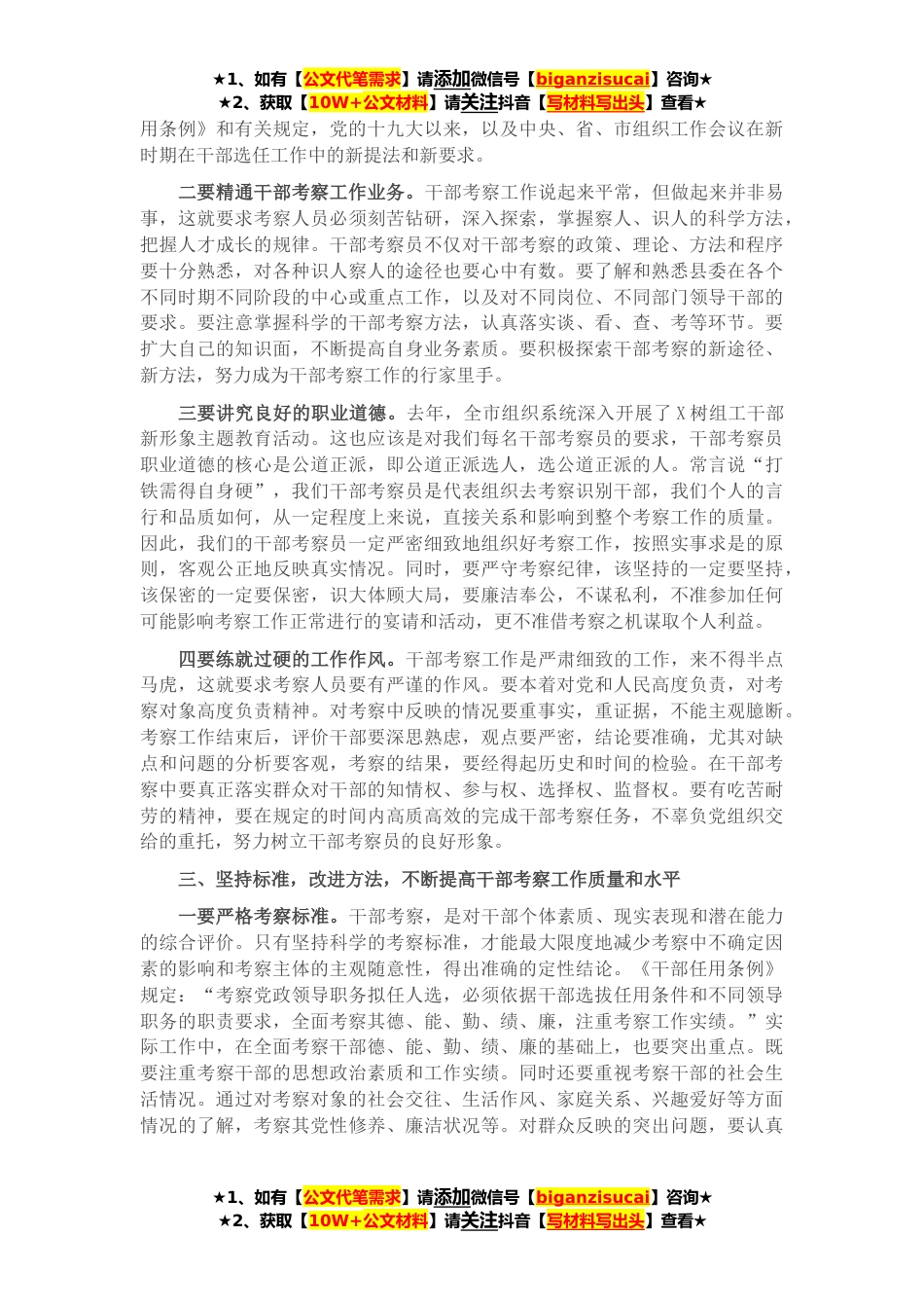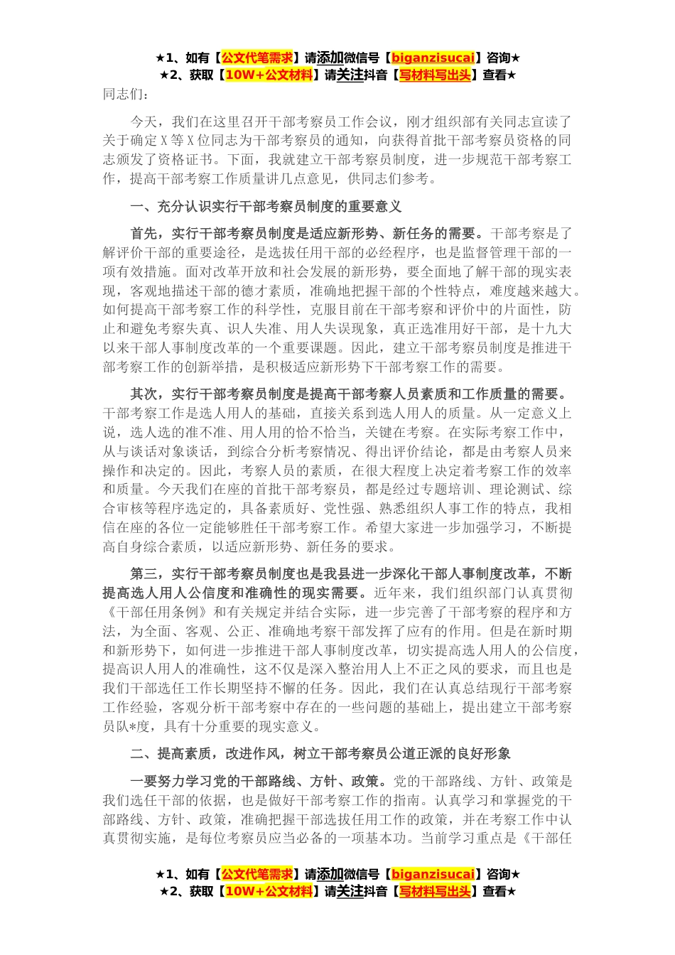 ★1、如有【公文代笔需求】请添加微信号【biganzisucai】咨询★★2、获取【10W+公文材料】请关注抖音【写材料写出头】查看★同志们:今天,我们在这里召开干部考察员工作会议,刚才组织部有关同志宣读了关于确定X等X位同志为干部考察员的通知,向获得首批干部考察员资格的同志颁发了资格证书。下面,我就建立干部考察员制度,进一步规范干部考察工作,提高干部考察工作质量讲几点意见,供同志们参考。一、充分认识实行干部考察员制度的重要意义首先,实行干部考察员制度是适应新形势、新任务的需要。干部考察是了解评价干部的重要途径,是选拔任用干部的必经程序,也是监督管理干部的一项有效措施。面对改革开放和社会发展的新形势,要全面地了解干部的现实表现,客观地描述干部的德才素质,准确地把握干部的个性...