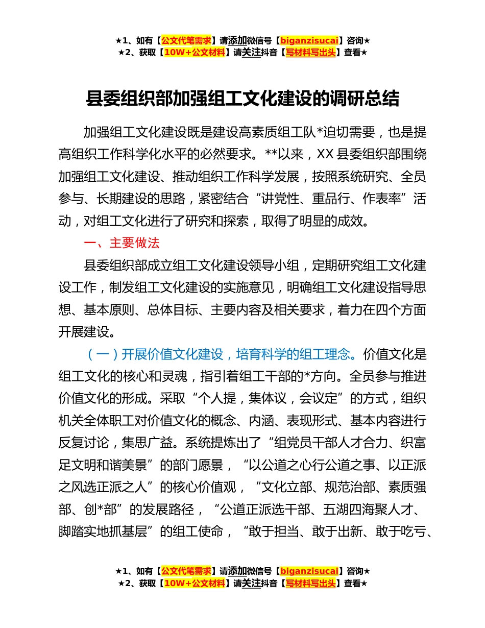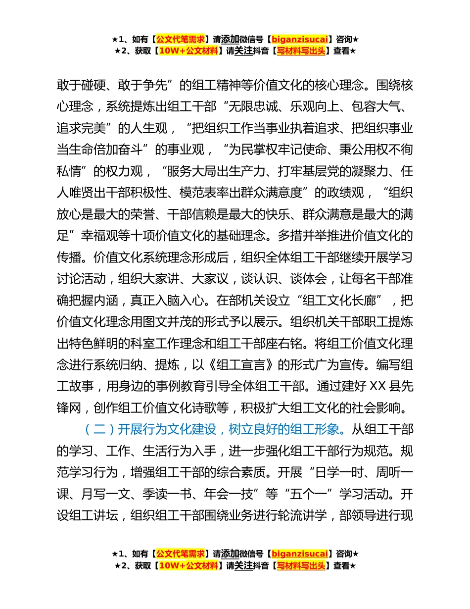 ★1、如有【公文代笔需求】请添加微信号【biganzisucai】咨询★★2、获取【10W+公文材料】请关注抖音【写材料写出头】查看★县委组织部加强组工文化建设的调研总结加强组工文化建设既是建设高素质组工队*迫切需要,也是提高组织工作科学化水平的必然要求。**以来,XX县委组织部围绕加强组工文化建设、推动组织工作科学发展,按照系统研究、全员参与、长期建设的思路,紧密结合“讲党性、重品行、作表率”活动,对组工文化进行了研究和探索,取得了明显的成效。一、主要做法县委组织部成立组工文化建设领导小组,定期研究组工文化建设工作,制发组工文化建设的实施意见,明确组工文化建设指导思想、基本原则、总体目标、主要内容及相关要求,着力在四个方面开展建设。(一)开展价值文化建设,培育科学的组工理念。...