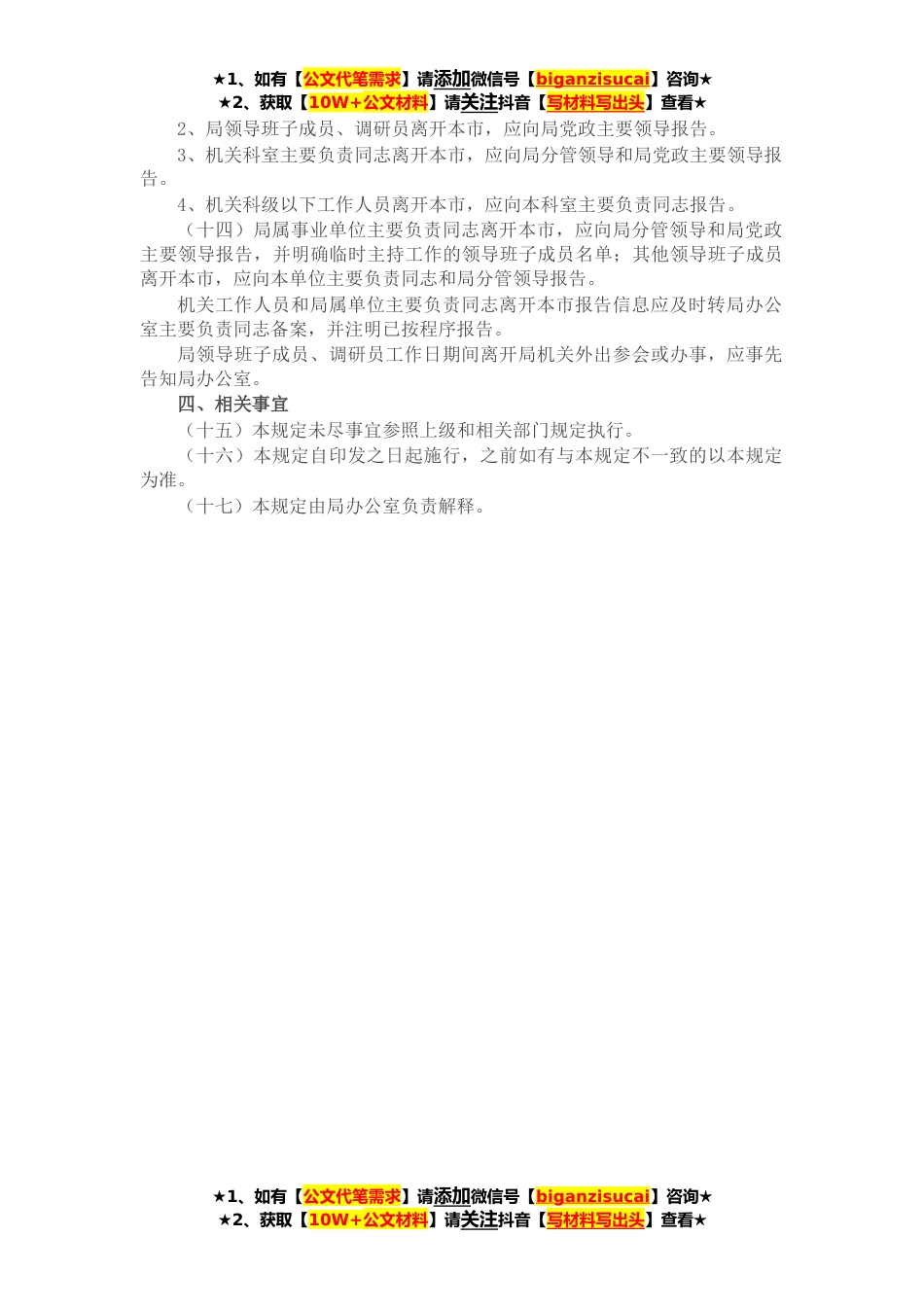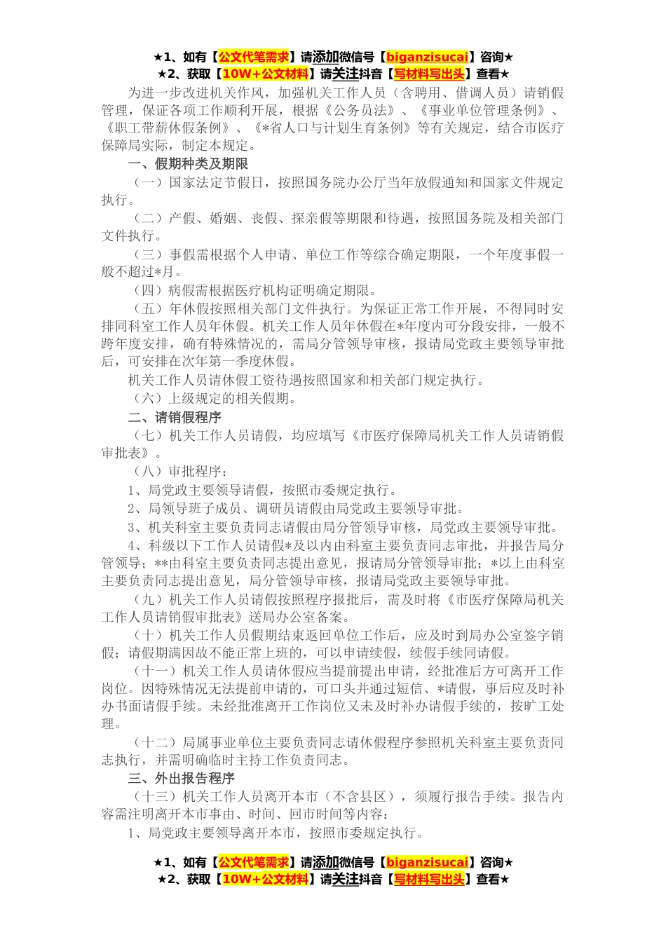 ★1、如有【公文代笔需求】请添加微信号【biganzisucai】咨询★★2、获取【10W+公文材料】请关注抖音【写材料写出头】查看★为进一步改进机关作风,加强机关工作人员(含聘用、借调人员)请销假管理,保证各项工作顺利开展,根据《公务员法》、《事业单位管理条例》、《职工带薪休假条例》、《*省人口与计划生育条例》等有关规定,结合市医疗保障局实际,制定本规定。一、假期种类及期限(一)国家法定节假日,按照国务院办公厅当年放假通知和国家文件规定执行。(二)产假、婚姻、丧假、探亲假等期限和待遇,按照国务院及相关部门文件执行。(三)事假需根据个人申请、单位工作等综合确定期限,一个年度事假一般不超过*月。(四)病假需根据医疗机构证明确定期限。(五)年休假按照相关部门文件执行。为保证正常...