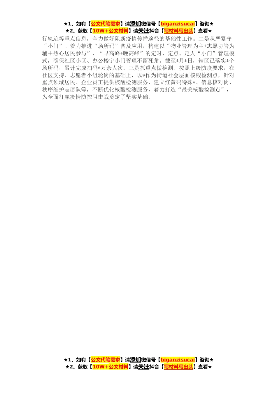 ★1、如有【公文代笔需求】请添加微信号【biganzisucai】咨询★★2、获取【10W+公文材料】请关注抖音【写材料写出头】查看★高新区“**疫情出现后,*街道党工委、办事处认真落实上级部署要求,立即进入战斗状态,以“四心”工作法抓实抓细抗疫工作,*阻击了疫情传播。周密部署,砥砺“坚如*”的必胜决心。一是准备早。高度重视疫情防控工作,在做好物资采购、储备的基础上,完善平战转换工作机制,组织制定战时应急预案,构建“街道—社区—网格—微网格”的四级疫情防控治理体系,联合*上级机关干部下沉**“微网格”,采取拉网式、地毯式扫楼摸企大排查,全面摸清街道人员底数。二是部署快。疫情就是命令,街道上下第一时间快速集结,按照《平战结合工作方案》有序启动流调协查、人员转运、物资保障以及三方联动...