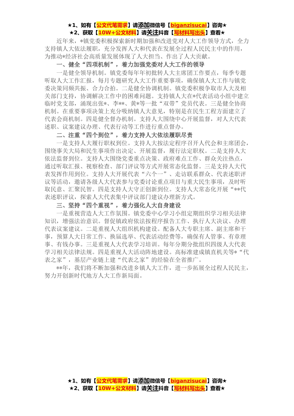 ★1、如有【公文代笔需求】请添加微信号【biganzisucai】咨询★★2、获取【10W+公文材料】请关注抖音【写材料写出头】查看★近年来,*镇党委积极探索新时期加强和改进党对人大工作领导方式,全力支持镇人大依法履职,充分发挥人大和代表在发展全过程人民民主中的作用,为推动*经济社会高质量发展体现了人大担当、作出了人大贡献。一、健全“四项机制”,着力加强党委对人大工作的领导一是健全领导机制。镇党委每年年初批转人大主席团工作要点,每季专题听取人大工作汇报,每月专题研究人大工作重要事项,确保镇人大工作与镇党委决策同频共振、合力合拍。二是健全协调机制。镇党委积极争取市人大及相关部门支持,协调解决工作中的困难问题。支持镇人大在*代表活动小组中建立临时党支部,涌现出张*、李**、黄*等一批...