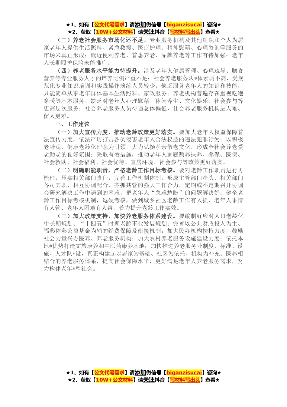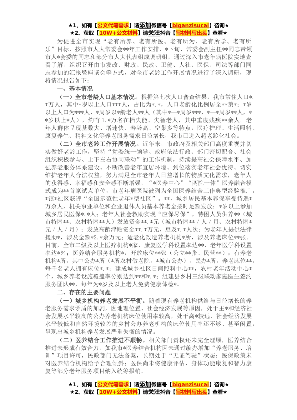 ★1、如有【公文代笔需求】请添加微信号【biganzisucai】咨询★★2、获取【10W+公文材料】请关注抖音【写材料写出头】查看★为促进全市实现“老有所养、老有所医、老有所为、老有所学、老有所乐”目标,按照市人大常委会**年工作安排,*下旬,常委会副主任**同志带领市人*会委的同志和部分市人大代表组成调研组,通过深入市老年病医院实地查看了解、组织召开由市发改、财政、民政、卫健、人社、医保、司法等部门同志参加的汇报暨座谈会等方式,对全市老龄工作开展情况进行了深入调研,现将情况报告如下:一、基本情况(一)全市老龄人口基本情况。根据第七次人口普查结果,我市常住人口*.*万人,其中*岁以上人口***人,占比为*.*,人口老龄化比例居全**第*;*岁以上人口为***人,*周岁以*龄老人**人(其中*—*周岁...