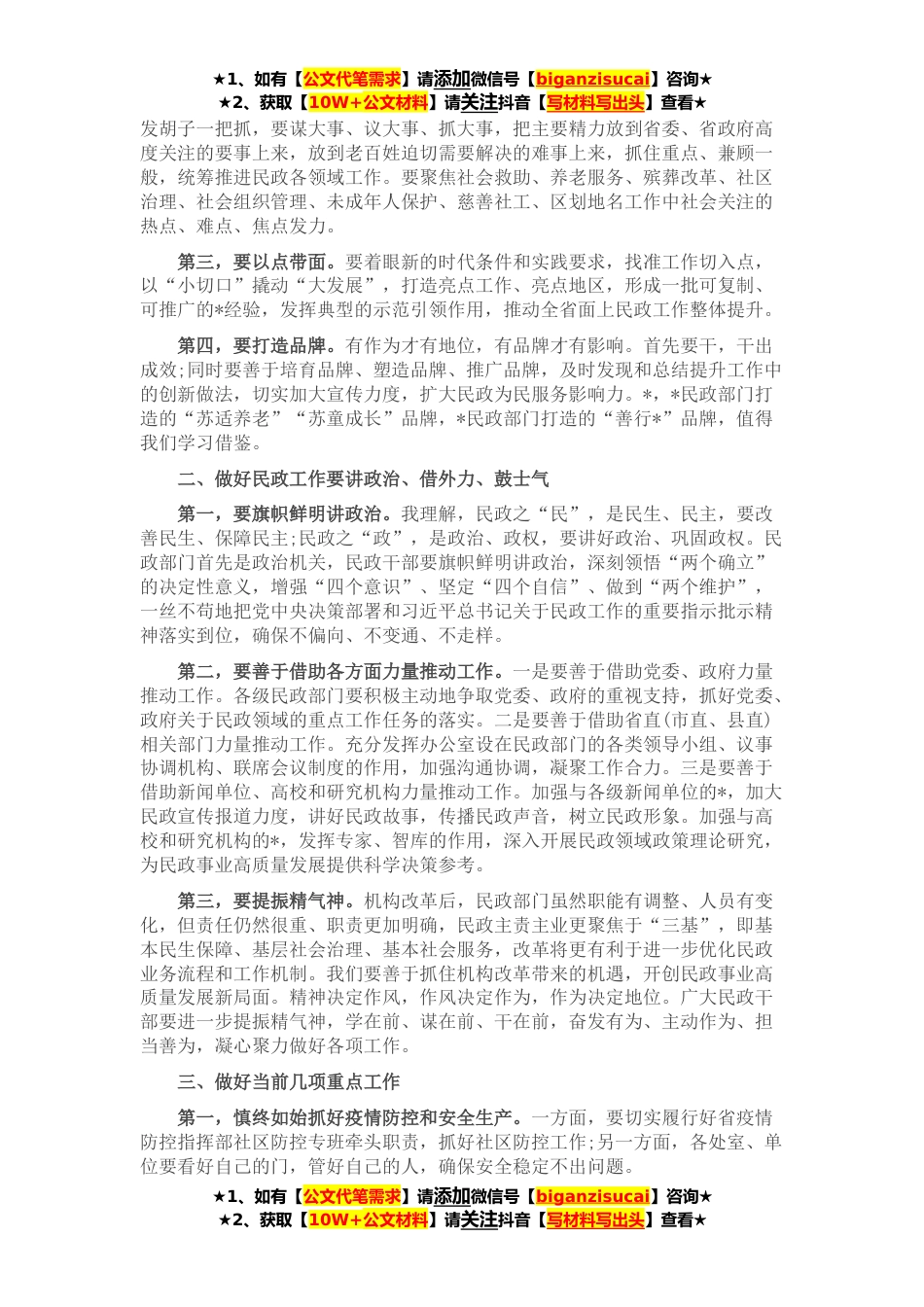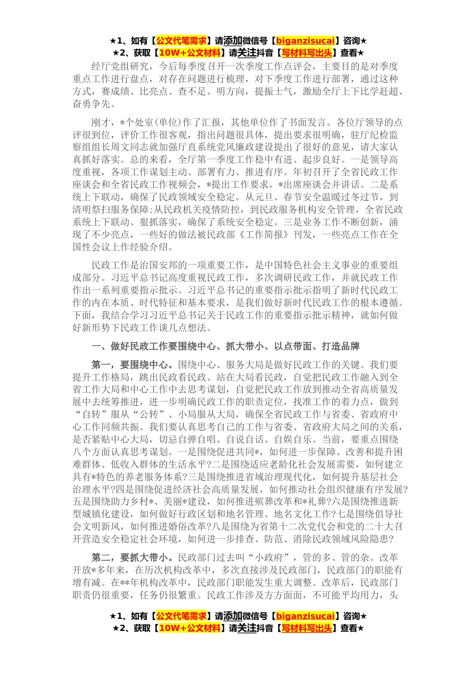 ★1、如有【公文代笔需求】请添加微信号【biganzisucai】咨询★★2、获取【10W+公文材料】请关注抖音【写材料写出头】查看★经厅党组研究,今后每季度召开一次季度工作点评会,主要目的是对季度重点工作进行盘点,对存在问题进行梳理,对下季度工作进行部署,通过这种方式,赛成绩、比亮点、查不足、明方向,提振士气,激励全厅上下比学赶超、奋勇争先。刚才,*个处室(单位)作了汇报,其他单位作了书面发言。各位厅领导的点评很到位,评价工作很客观,指出问题很具体,提出要求很明确,驻厅纪检监察组组长周文同志就加强厅直系统党风廉政建设提出了很好的意见,请大家认真抓好落实。总的来看,全厅第一季度工作稳中有进、起步良好。一是领导高度重视,各项工作谋划主动、部署有力、推进有序。年初召开了全省民政工...