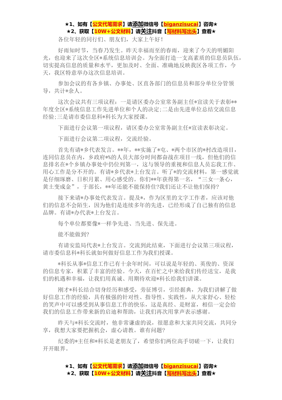 ★1、如有【公文代笔需求】请添加微信号【biganzisucai】咨询★★2、获取【10W+公文材料】请关注抖音【写材料写出头】查看★各位年轻的同行们、朋友们,大家上午好!好雨知时节,当春乃发生。昨天幸福而至的春雨,迎来了今天的明媚阳光,也迎来了这次全区*系统信息培训会。为全面打造一支高素质的信息员队伍,切实提高信息的质量和水平,更加及时、全面、准确地反映我区各项工作,今天,我区特意举办这次信息培训。参加会议的有各乡镇、办事处、区直各部门的信息员和部分单位分管领导,共计*余人。这次会议共有三项议程:一是请区委办公室常务副主任*宣读关于表彰**年度全区*系统信息工作先进单位和个人的决定;二是由先进单位总结交流信息经验;三是请市委信息科*科长为大家授课。下面进行会议第一项议程,请区委办...