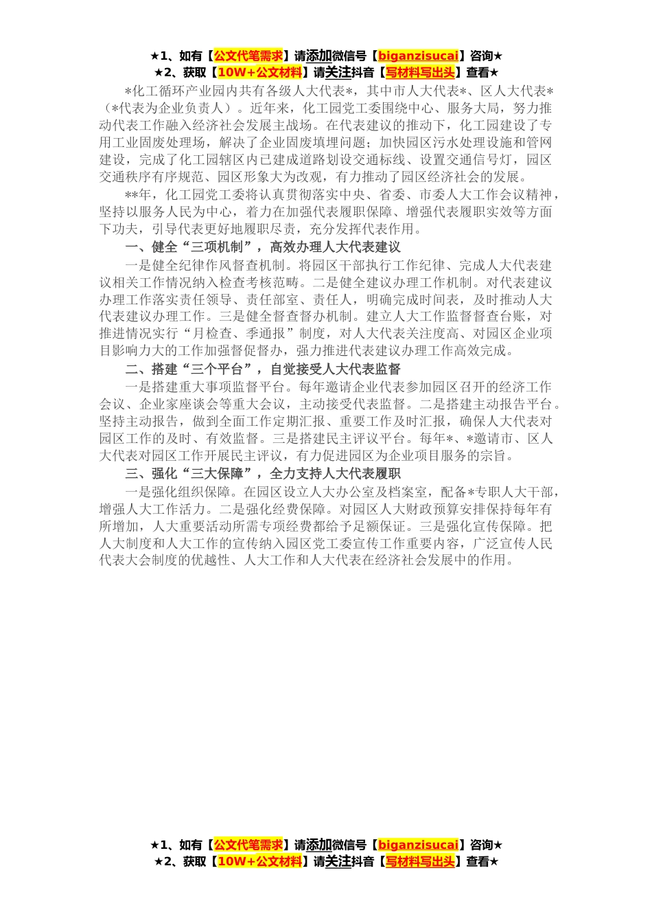 ★1、如有【公文代笔需求】请添加微信号【biganzisucai】咨询★★2、获取【10W+公文材料】请关注抖音【写材料写出头】查看★*化工循环产业园内共有各级人大代表*,其中市人大代表*、区人大代表*(*代表为企业负责人)。近年来,化工园党工委围绕中心、服务大局,努力推动代表工作融入经济社会发展主战场。在代表建议的推动下,化工园建设了专用工业固废处理场,解决了企业固废填埋问题;加快园区污水处理设施和管网建设,完成了化工园辖区内已建成道路划设交通标线、设置交通信号灯,园区交通秩序有序规范、园区形象大为改观,有力推动了园区经济社会的发展。**年,化工园党工委将认真贯彻落实中央、省委、市委人大工作会议精神,坚持以服务人民为中心,着力在加强代表履职保障、增强代表履职实效等方面下功夫,引...