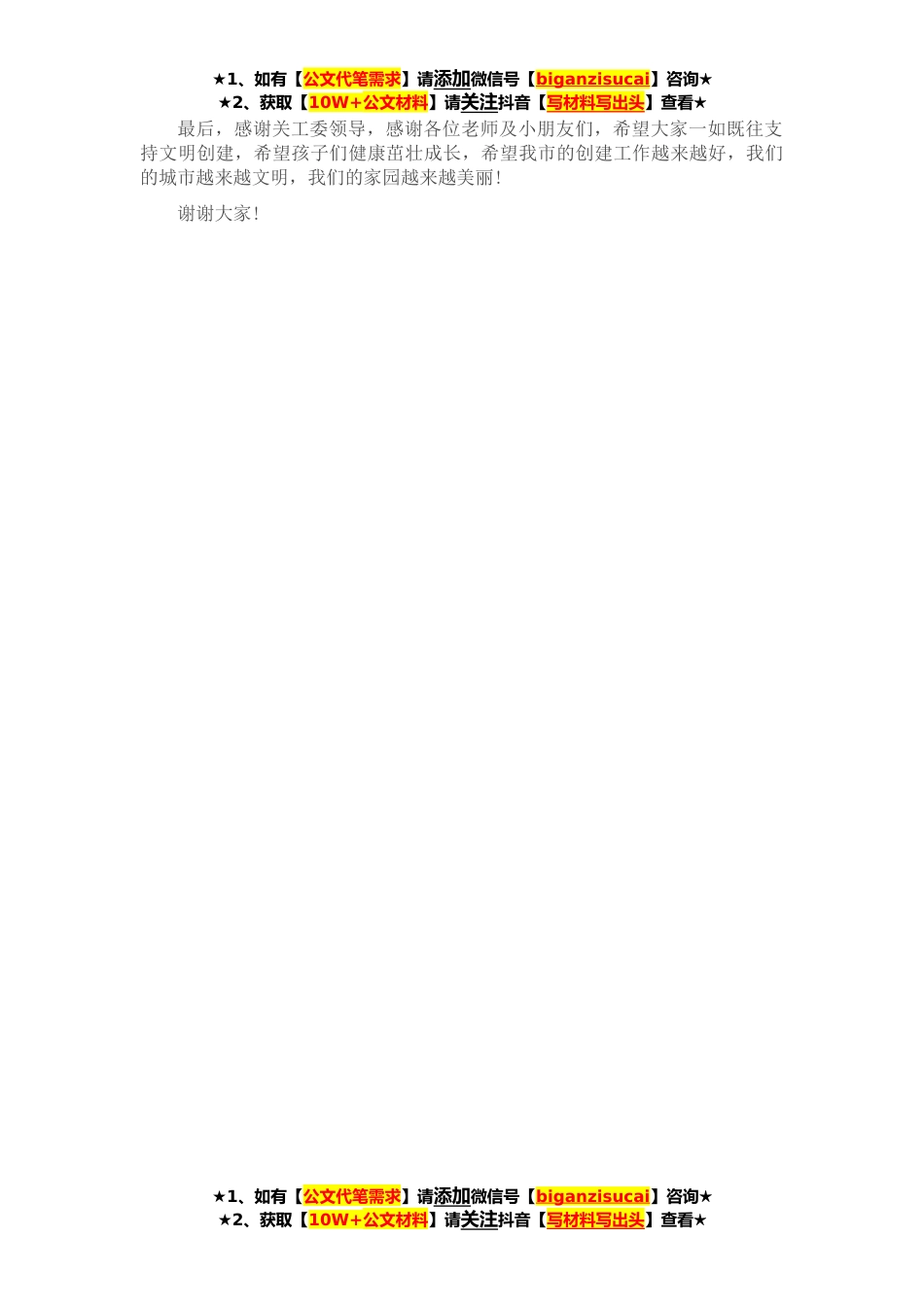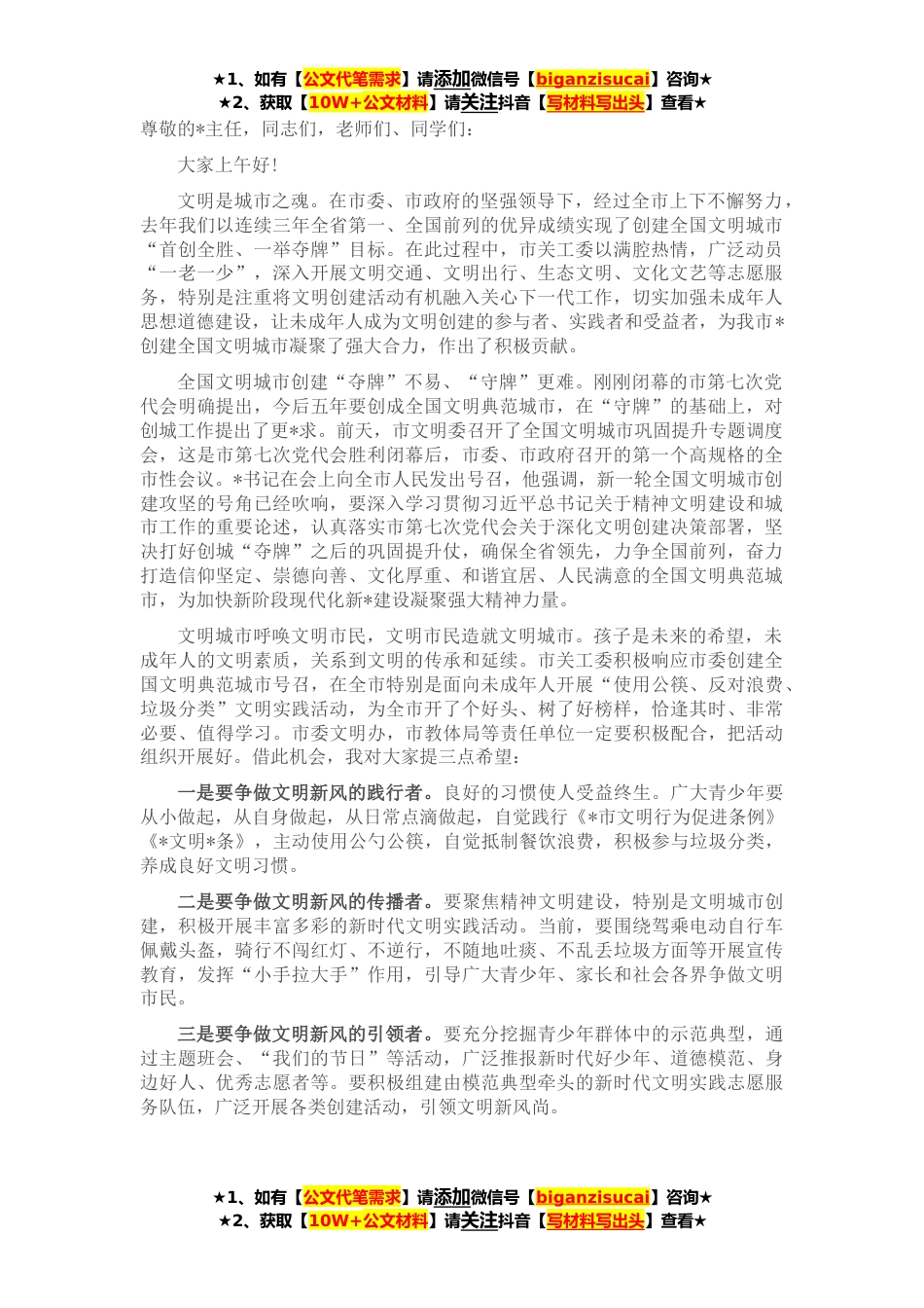 ★1、如有【公文代笔需求】请添加微信号【biganzisucai】咨询★★2、获取【10W+公文材料】请关注抖音【写材料写出头】查看★尊敬的*主任,同志们,老师们、同学们:大家上午好!文明是城市之魂。在市委、市政府的坚强领导下,经过全市上下不懈努力,去年我们以连续三年全省第一、全国前列的优异成绩实现了创建全国文明城市“首创全胜、一举夺牌”目标。在此过程中,市关工委以满腔热情,广泛动员“一老一少”,深入开展文明交通、文明出行、生态文明、文化文艺等志愿服务,特别是注重将文明创建活动有机融入关心下一代工作,切实加强未成年人思想道德建设,让未成年人成为文明创建的参与者、实践者和受益者,为我市*创建全国文明城市凝聚了强大合力,作出了积极贡献。全国文明城市创建“夺牌”不易、“守牌”更难。...