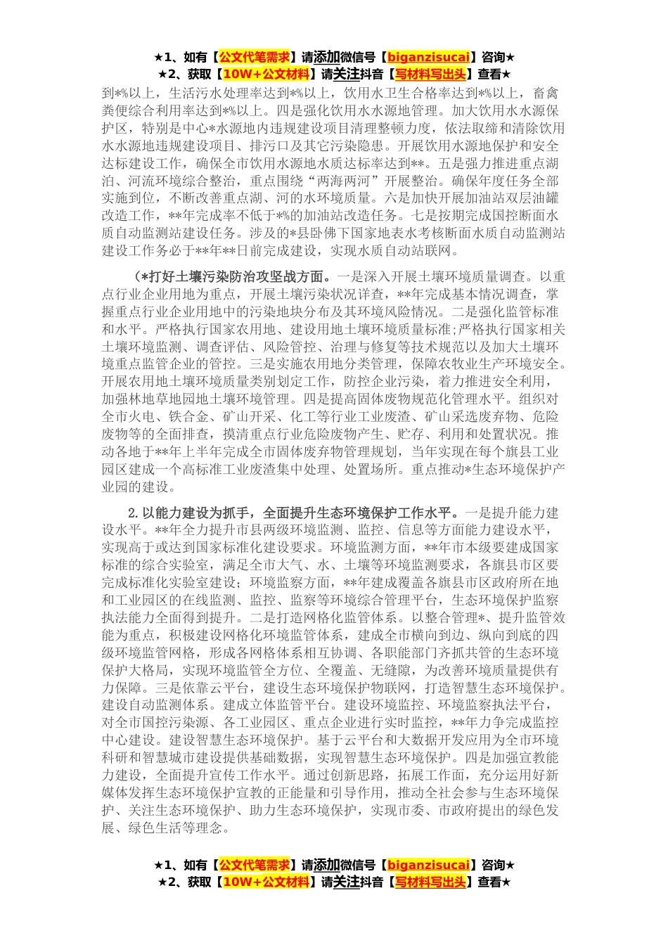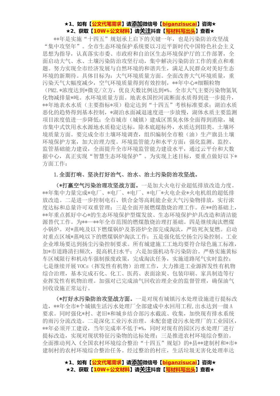 ★1、如有【公文代笔需求】请添加微信号【biganzisucai】咨询★★2、获取【10W+公文材料】请关注抖音【写材料写出头】查看★**年是实施“十四五”规划承上启下的关键一年,也是污染防治攻坚战“集中攻坚年”。全市生态环境保护系统要以习近平新时代中国特色社会主义思想为指导,认真落实市委、市政府和自治区生态环境保护厅的工作部署,全面启动大气、水、土壤污染防治攻坚行动,集中解决污染防治工作的重点和难题。努力实现全市经济发展与自然环境的和谐共生,满足人民群众对美好生态环境的新期待。具体目标为:大气环境质量方面。全面改善大气环境质量,重污染天气大幅度减少,空气环境质量得到有效控制,**年中心*细颗粒物(PM2.*浓度达到*微克/立方,优良天数比例达到*%。全市大气主要污染物氮氧化物减排量*吨...