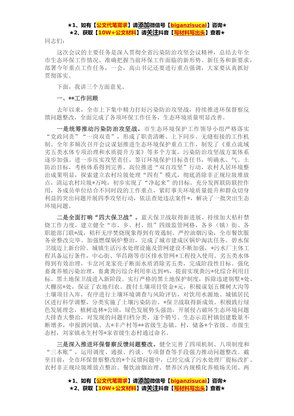 ★1、如有【公文代笔需求】请添加微信号【biganzisucai】咨询★★2、获取【10W+公文材料】请关注抖音【写材料写出头】查看★同志们:这次会议的主要任务是深入贯彻全省污染防治攻坚会议精神,总结去年全市生态环保工作情况,准确把握当前环保工作面临的新形势、新任务和新要求,部署今年重点工作任务,一会,高山书记还要进行重点强调,大家要认真抓好贯彻落实。下面,我讲三个方面意见。一、**工作回顾去年以来,全市上下集中精力打好污染防治攻坚战,持续推进环保督察反馈问题整改,全面完成了各项环保工作任务,生态环境质量明显改善。一是统筹推动污染防治攻坚战。市生态环境保护工作领导小组严格落实“党政同责”“一岗双责”,形成了职责清晰、上下同步、无缝衔接的工作机制。全年多频次召开会议谋划推进生...