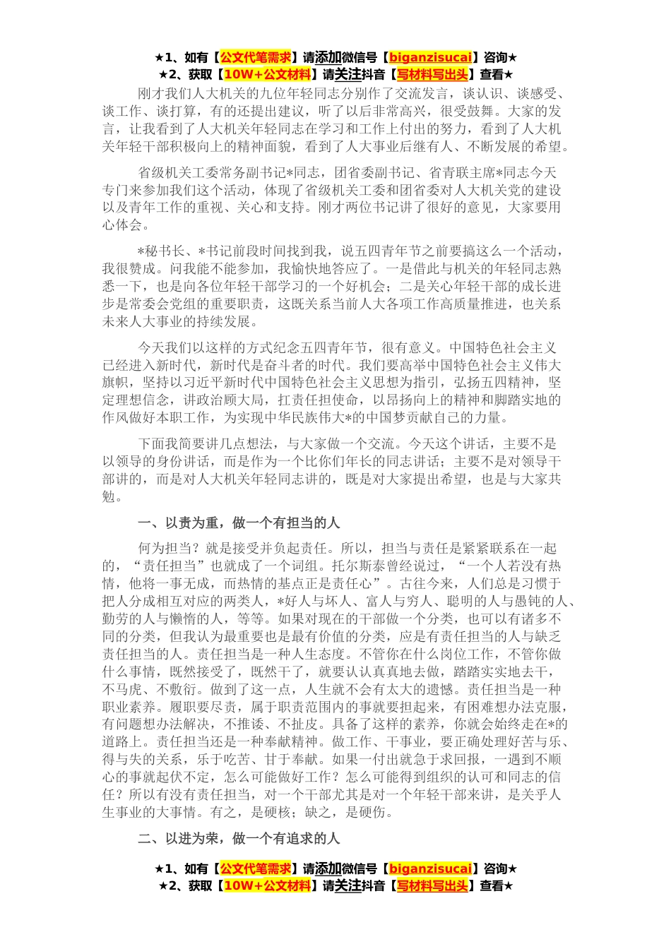★1、如有【公文代笔需求】请添加微信号【biganzisucai】咨询★★2、获取【10W+公文材料】请关注抖音【写材料写出头】查看★刚才我们人大机关的九位年轻同志分别作了交流发言,谈认识、谈感受、谈工作、谈打算,有的还提出建议,听了以后非常高兴,很受鼓舞。大家的发言,让我看到了人大机关年轻同志在学习和工作上付出的努力,看到了人大机关年轻干部积极向上的精神面貌,看到了人大事业后继有人、不断发展的希望。省级机关工委常务副书记*同志,团省委副书记、省青联主席*同志今天专门来参加我们这个活动,体现了省级机关工委和团省委对人大机关党的建设以及青年工作的重视、关心和支持。刚才两位书记讲了很好的意见,大家要用心体会。*秘书长、*书记前段时间找到我,说五四青年节之前要搞这么一个活动,我很赞...