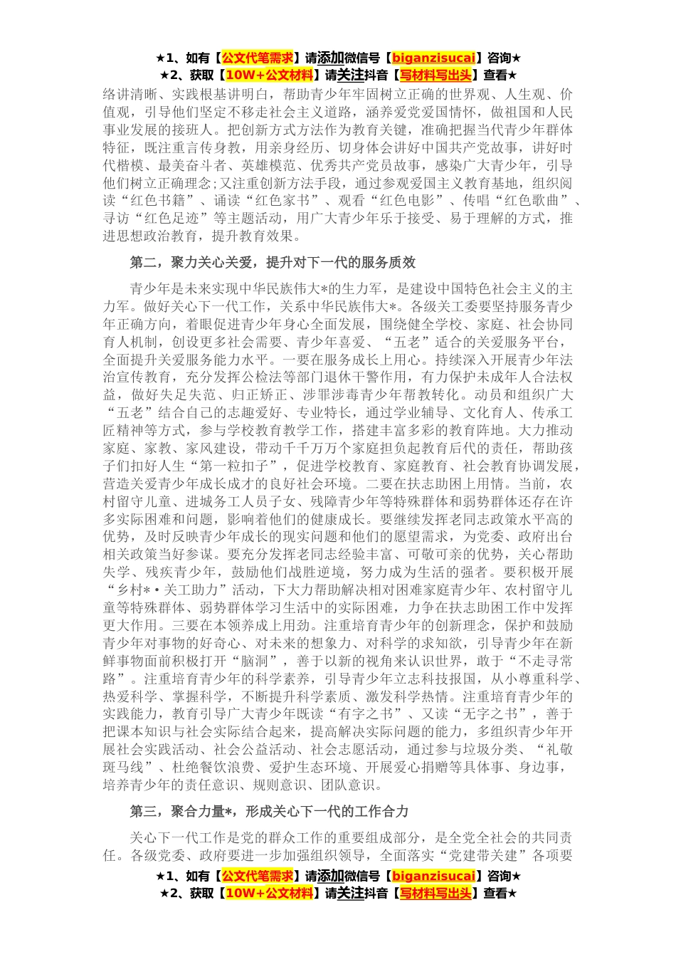 ★1、如有【公文代笔需求】请添加微信号【biganzisucai】咨询★★2、获取【10W+公文材料】请关注抖音【写材料写出头】查看★各位老领导、同志们:今天的会议是经市委同意召开的,主要任务是深入学习贯彻习近平总书记关于做好关心下一代工作的重要指示精神,总结**工作,部署今年重点任务,推动我市关心下一代事业立足新阶段、实现新发展、再创新佳绩。刚才,会议对**全市关工委“双十佳”进行了表彰,*主任作了一个很好的工作报告,对**年工作进行了部署,我都同意,希望大家抓好贯彻落实。刚刚过去的**是极不平凡的一年。面对新冠肺炎疫情冲击,全市各级关工委在市委、市政府正确领导下,团结带领广大“五老”,坚持疫情防控和关爱教育“两手抓”,关心下一代各项工作取得新进展、收到新成效。突出体现在“四个更...