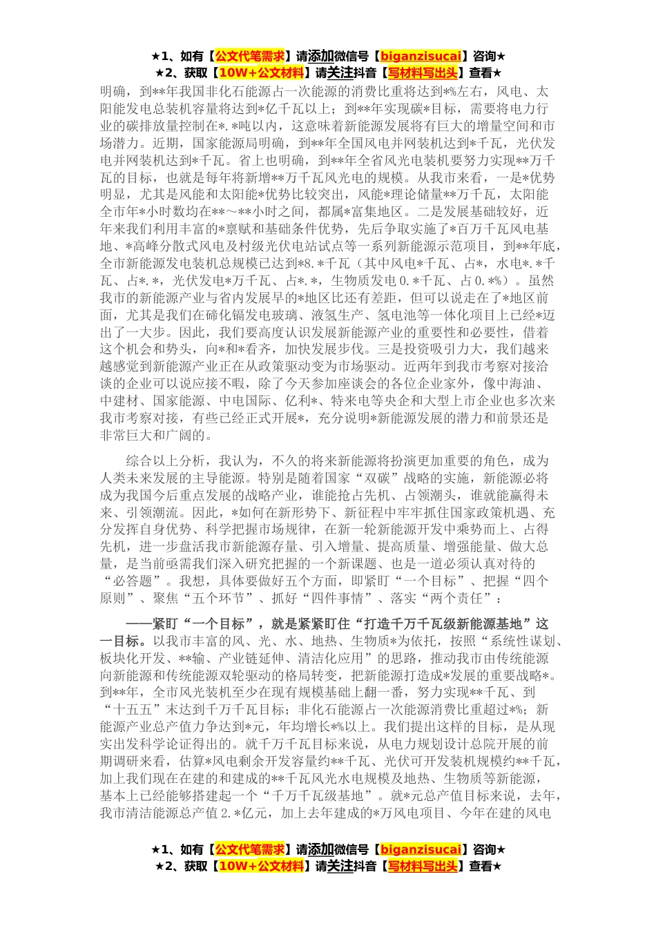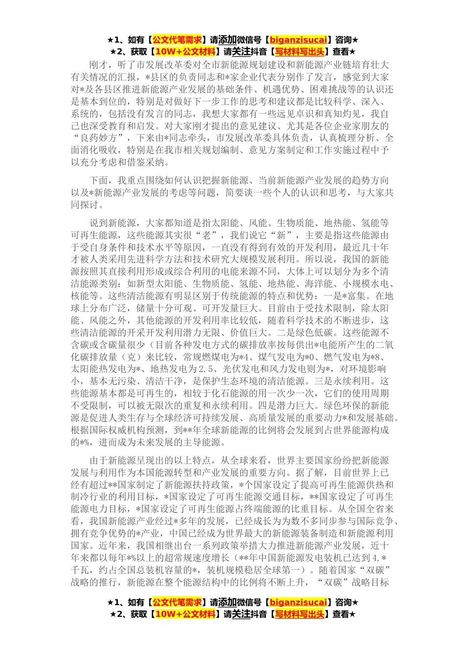 ★1、如有【公文代笔需求】请添加微信号【biganzisucai】咨询★★2、获取【10W+公文材料】请关注抖音【写材料写出头】查看★刚才,听了市发展改革委对全市新能源规划建设和新能源产业链培育壮大有关情况的汇报,*县区的负责同志和*家企业代表分别作了发言,感觉到大家对*及各县区推进新能源产业发展的基础条件、机遇优势、困难挑战等的认识还是基本到位的,特别是对做好下一步工作的思考和建议都是比较科学、深入、系统的,包括没有发言的同志,我想大家都有一些远见卓识和真知灼见,我自己也深受教育和启发。对大家刚才提出的意见建议、尤其是各位企业家朋友的“良药妙方”,下来由*同志牵头,市发展改革委具体负责,认真梳理分析、全面消化吸收,特别是在我市相关规划编制、意见方案制定和工作实施过程中予以充...