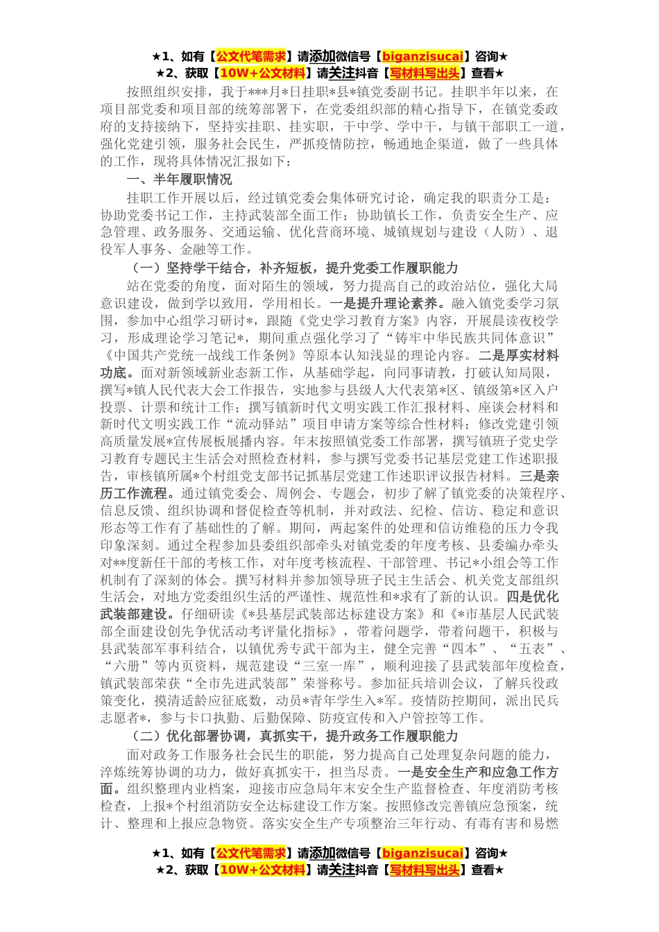 ★1、如有【公文代笔需求】请添加微信号【biganzisucai】咨询★★2、获取【10W+公文材料】请关注抖音【写材料写出头】查看★按照组织安排,我于***月*日挂职*县*镇党委副书记。挂职半年以来,在项目部党委和项目部的统筹部署下,在党委组织部的精心指导下,在镇党委政府的支持接纳下,坚持实挂职、挂实职,干中学、学中干,与镇干部职工一道,强化党建引领,服务社会民生,严抓疫情防控,畅通地企渠道,做了一些具体的工作,现将具体情况汇报如下:一、半年履职情况挂职工作开展以后,经过镇党委会集体研究讨论,确定我的职责分工是:协助党委书记工作,主持武装部全面工作;协助镇长工作,负责安全生产、应急管理、政务服务、交通运输、优化营商环境、城镇规划与建设(人防)、退役军人事务、金融等工作。(一)...