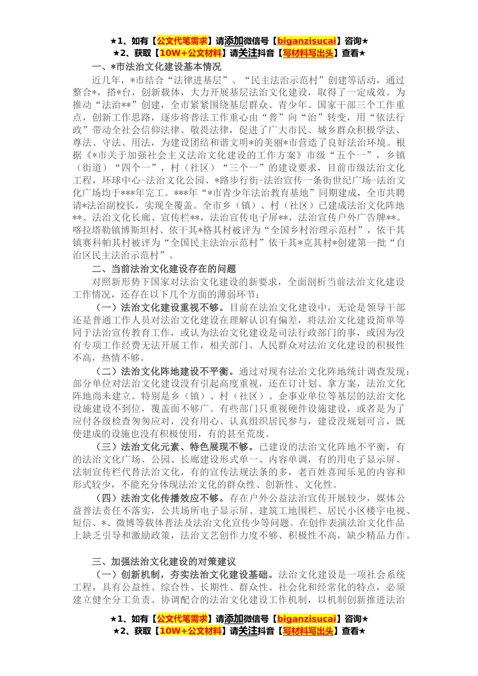 ★1、如有【公文代笔需求】请添加微信号【biganzisucai】咨询★★2、获取【10W+公文材料】请关注抖音【写材料写出头】查看★一、*市法治文化建设基本情况近几年,*市结合“法律进基层”、“民主法治示范村”创建等活动,通过整合*,搭*台,创新载体,大力开展基层法治文化建设,取得了一定成效。为推动“法治**”创建,全市紧紧围绕基层群众、青少年、国家干部三个工作重点,创新工作思路,逐步将普法工作重心由“普”向“治”转变,用“依法行政”带动全社会信仰法律、敬畏法律,促进了广大市民、城乡群众积极学法、尊法、守法、用法,为建设团结和谐文明*的美丽*市营造了良好法治环境。根据《*市关于加强社会主义法治文化建设的工作方案》市级“五个一”,乡镇(街道)“四个一”,村(社区)“三个一”的建设要...