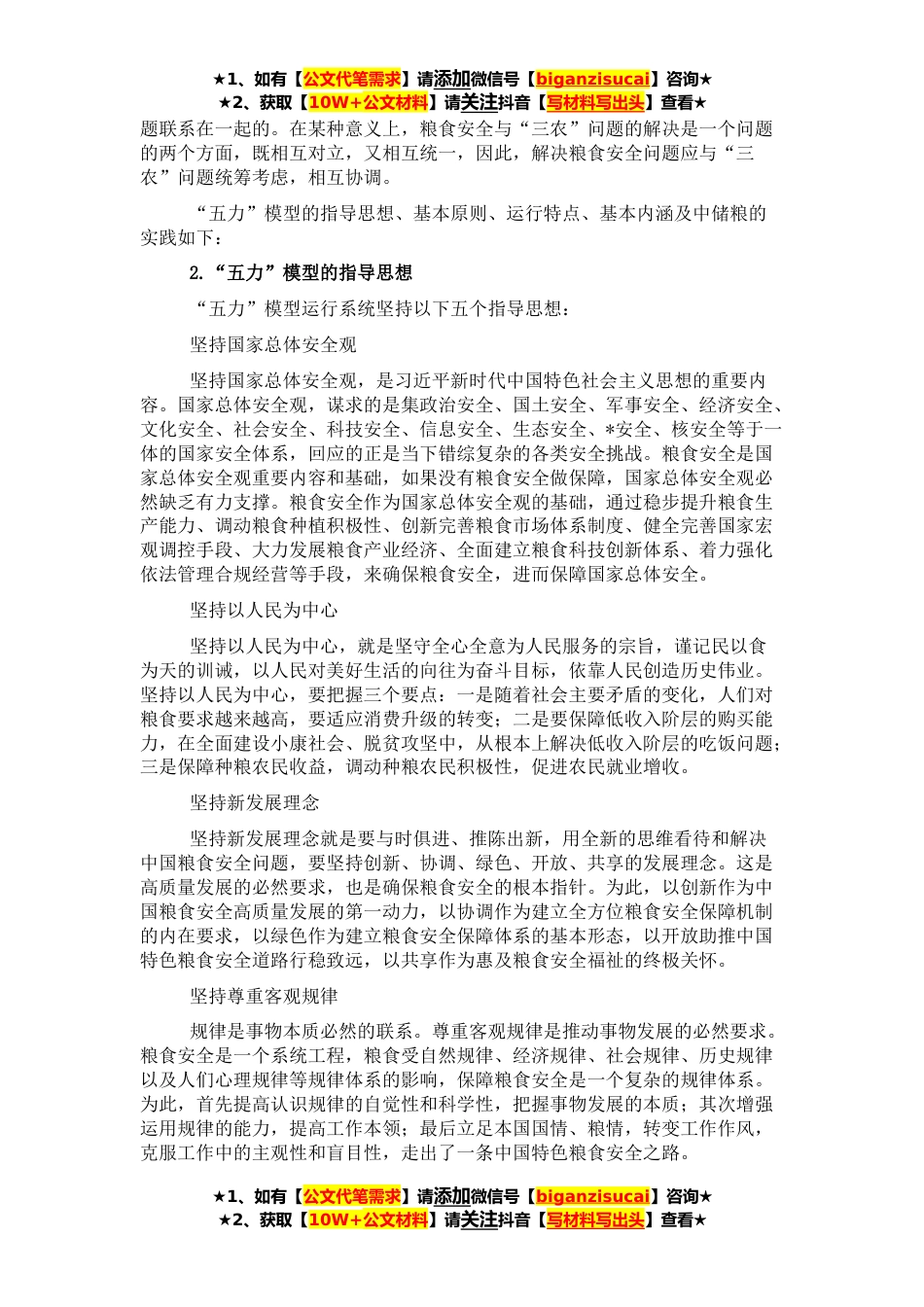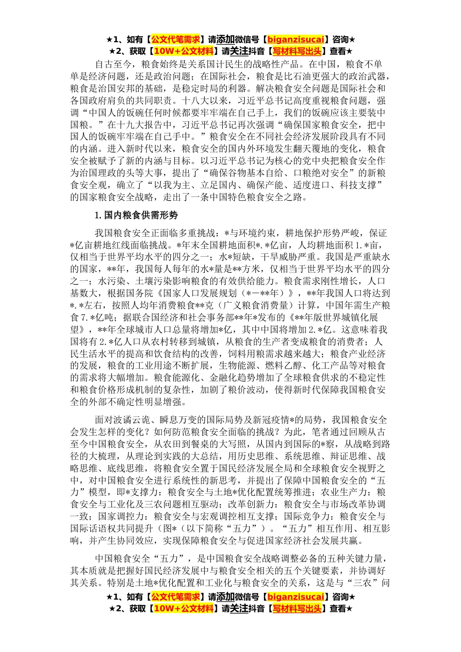 ★1、如有【公文代笔需求】请添加微信号【biganzisucai】咨询★★2、获取【10W+公文材料】请关注抖音【写材料写出头】查看★自古至今,粮食始终是关系国计民生的战略性产品。在中国,粮食不单单是经济问题,还是政治问题;在国际社会,粮食是比石油更强大的政治武器,粮食是治国安邦的基础,是稳定时局的利器。解决粮食安全问题是国际社会和各国政府肩负的共同职责。十八大以来,习近平总书记高度重视粮食问题,强调“中国人的饭碗任何时候都要牢牢端在自己手上,我们的饭碗应该主要装中国粮。”在十九大报告中,习近平总书记再次强调“确保国家粮食安全,把中国人的饭碗牢牢端在自己手中。”粮食安全在不同社会经济发展阶段具有不同的内涵。进入新时代以来,粮食安全的国内外环境发生翻天覆地的变化,粮食安全被...