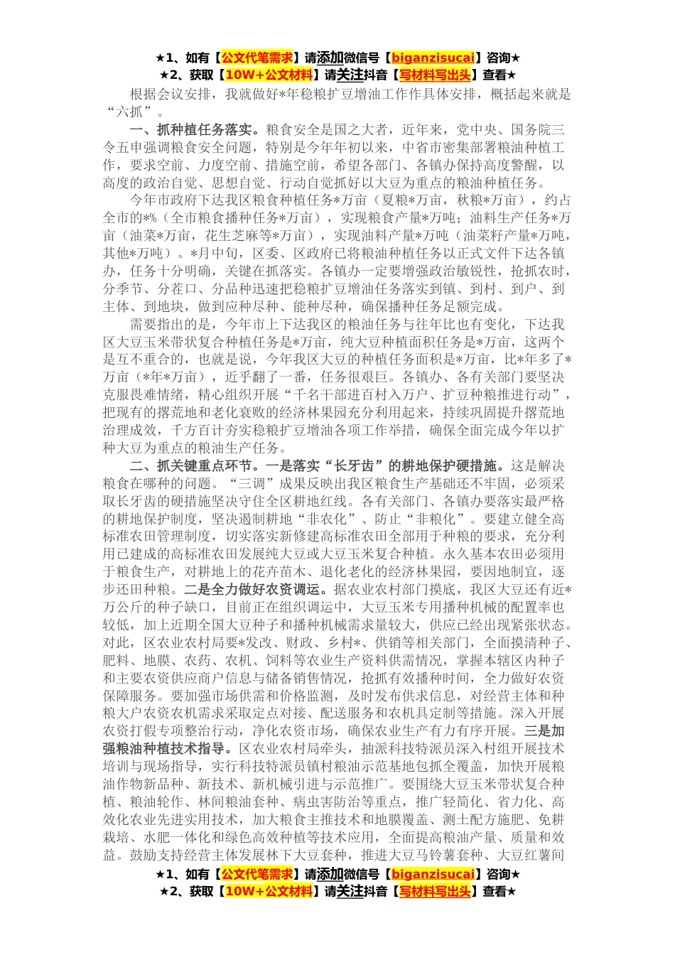 ★1、如有【公文代笔需求】请添加微信号【biganzisucai】咨询★★2、获取【10W+公文材料】请关注抖音【写材料写出头】查看★根据会议安排,我就做好*年稳粮扩豆增油工作作具体安排,概括起来就是“六抓”。一、抓种植任务落实。粮食安全是国之大者,近年来,党中央、国务院三令五申强调粮食安全问题,特别是今年年初以来,中省市密集部署粮油种植工作,要求空前、力度空前、措施空前,希望各部门、各镇办保持高度警醒,以高度的政治自觉、思想自觉、行动自觉抓好以大豆为重点的粮油种植任务。今年市政府下达我区粮食种植任务*万亩(夏粮*万亩,秋粮*万亩),约占全市的*%(全市粮食播种任务*万亩),实现粮食产量*万吨;油料生产任务*万亩(油菜*万亩,花生芝麻等*万亩),实现油料产量*万吨(油菜籽产量*万吨,其...
