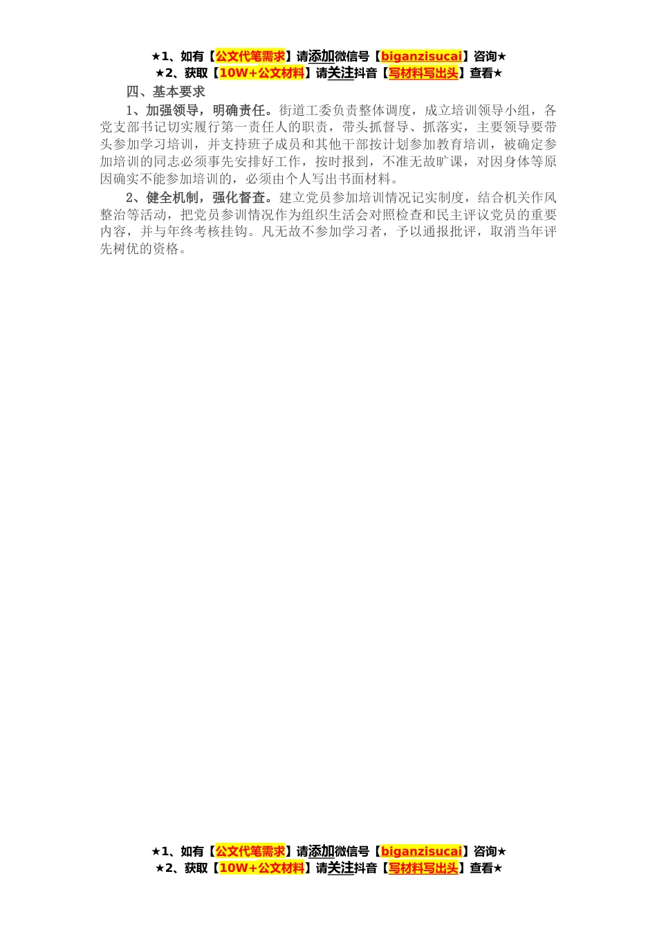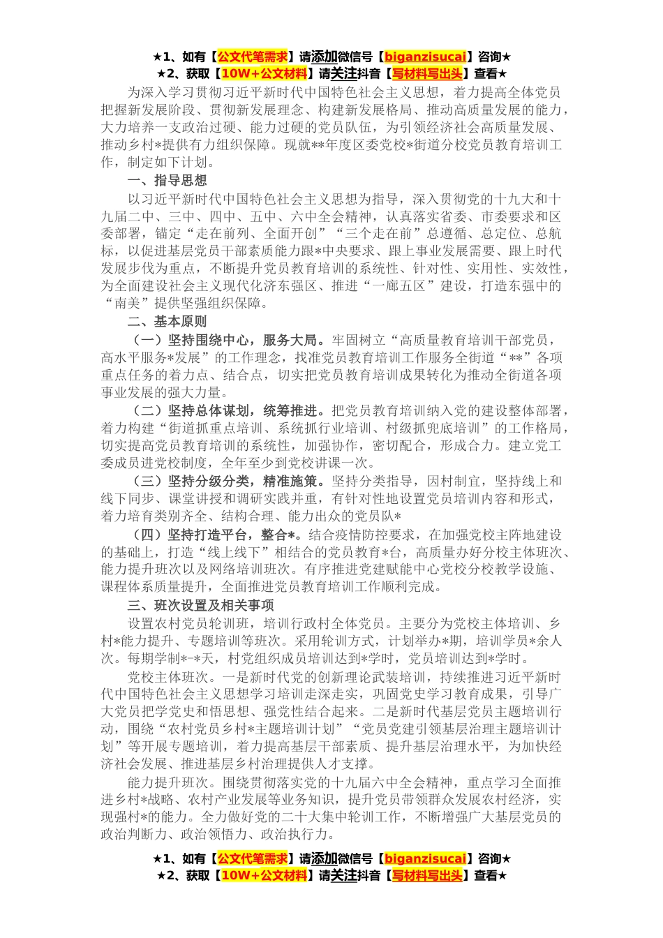 ★1、如有【公文代笔需求】请添加微信号【biganzisucai】咨询★★2、获取【10W+公文材料】请关注抖音【写材料写出头】查看★为深入学习贯彻习近平新时代中国特色社会主义思想,着力提高全体党员把握新发展阶段、贯彻新发展理念、构建新发展格局、推动高质量发展的能力,大力培养一支政治过硬、能力过硬的党员队伍,为引领经济社会高质量发展、推动乡村*提供有力组织保障。现就**年度区委党校*街道分校党员教育培训工作,制定如下计划。一、指导思想以习近平新时代中国特色社会主义思想为指导,深入贯彻党的十九大和十九届二中、三中、四中、五中、六中全会精神,认真落实省委、市委要求和区委部署,锚定“走在前列、全面开创”“三个走在前”总遵循、总定位、总航标,以促进基层党员干部素质能力跟*中央要求、跟上...