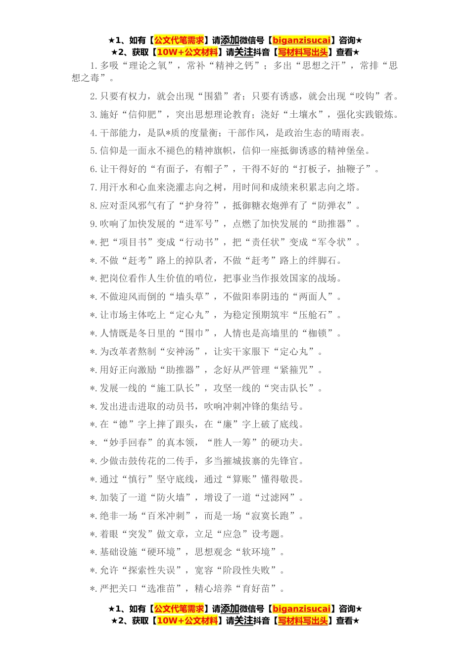 ★1、如有【公文代笔需求】请添加微信号【biganzisucai】咨询★★2、获取【10W+公文材料】请关注抖音【写材料写出头】查看★1.多吸“理论之氧”,常补“精神之钙”;多出“思想之汗”,常排“思想之毒”。2.只要有权力,就会出现“围猎”者;只要有诱惑,就会出现“咬钩”者。3.施好“信仰肥”,突出思想理论教育;浇好“土壤水”,强化实践锻炼。4.干部能力,是队*质的度量衡;干部作风,是政治生态的晴雨表。5.信仰是一面永不褪色的精神旗帜,信仰一座抵御诱惑的精神堡垒。6.让干得好的“有面子,有帽子”,干得不好的“打板子,抽鞭子”。7.用汗水和心血来浇灌志向之树,用时间和成绩来积累志向之塔。8.应对歪风邪气有了“护身符”,抵御糖衣炮弹有了“防弹衣”。9.吹响了加快发展的“进军号”,点燃了加快发展...