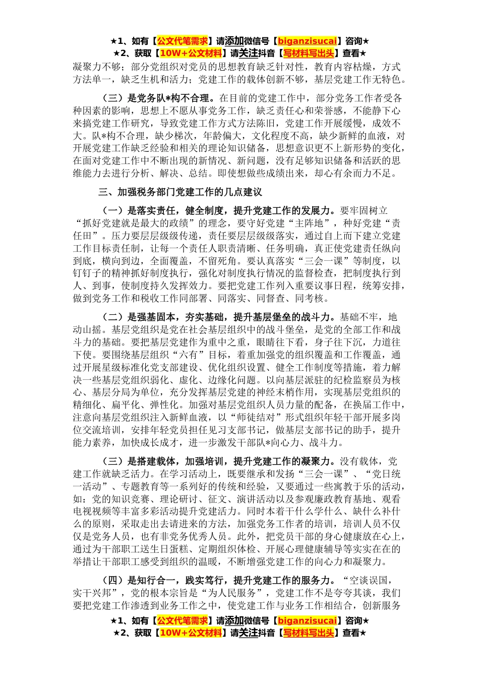 ★1、如有【公文代笔需求】请添加微信号【biganzisucai】咨询★★2、获取【10W+公文材料】请关注抖音【写材料写出头】查看★党政军民学,东西南北中,党是领导一切的。党建工作是税务部门实现经济管理职能,完成为国聚财使命的组织保障。新时代下,如何推进党建工作和业务工作融合发展是我们都需要面对的共同课题。一、加强税务部门党建工作的重要意义(一)加强党建工作是促进税收事业发展的形势需求。税收是国家财政收入的主要来源,是国家进行宏观调控的重要手段。党的十九大对全面建设社会主义现代化国家,实现中华民族伟大*作出了战略部署,习近平新时代中国特色社会主义思想为我们今后的税务工作提供了思想指导,指明了方向,同时也为税务部门党建工作提出了新的更高的要求,这必将带来我国经济社会新的大的...