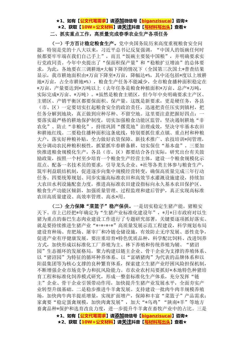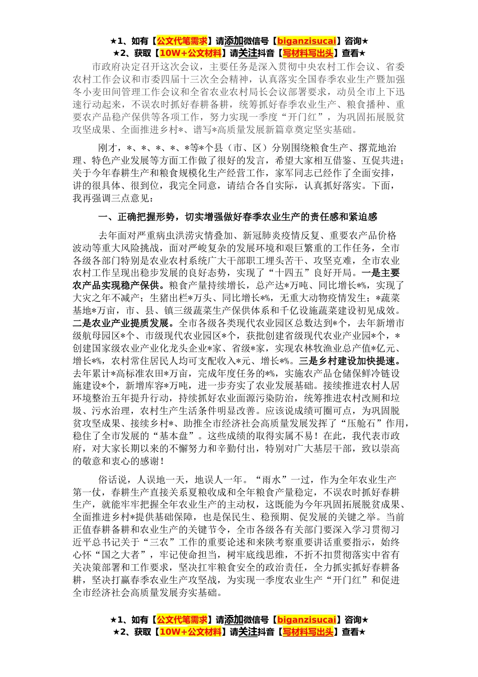 ★1、如有【公文代笔需求】请添加微信号【biganzisucai】咨询★★2、获取【10W+公文材料】请关注抖音【写材料写出头】查看★市政府决定召开这次会议,主要任务是深入贯彻中央农村工作会议、省委农村工作会议和市委四届十三次全会精神,认真落实全国春季农业生产暨加强冬小麦田间管理工作会议和全省农业农村局长会议部署要求,动员全市上下迅速行动起来,不误农时抓好春耕备耕,统筹抓好春季农业生产、粮食播种、重要农产品稳产保供等各项工作,努力实现一季度“开门红”,为巩固拓展脱贫攻坚成果、全面推进乡村*、谱写*高质量发展新篇章奠定坚实基础。刚才,*、*、*、*、*等*个县(市、区)分别围绕粮食生产、撂荒地治理、特色产业发展等方面工作做了很好的发言,希望大家相互借鉴、互促共进;关于今年春耕生产和...