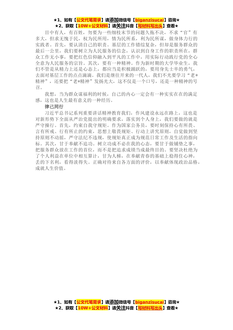 ★1、如有【公文代笔需求】请添加微信号【biganzisucai】咨询★★2、获取【10W+公文材料】请关注抖音【写材料写出头】查看★选择了就是为了更好的坚持,不断修炼才能遇见最好的自己。到基层锻炼的我们,同时也要接过为人民服务的责任。对于工作,我也在思考,怎样才能不断的提高自身的能力素质,较好地应对基层工作。通过到基层锻炼这段时间我感到,应从修炼“五行”着手,做到审而再行、思而后行、雷利风行、尽力而行、律己同行,真正把一名基层工作者的责任落实到实处。审而再行做好基层工作,必须具有独特的眼光,工作中,要在懂团结,会团结的前提下,审视而行,应势而动,顺势而为,把群众性工作做到前面。首先,增强政治敏感性和鉴别力。工作要求真务实,形势好时更要清醒头脑,作为直面群众的基层公务员,...