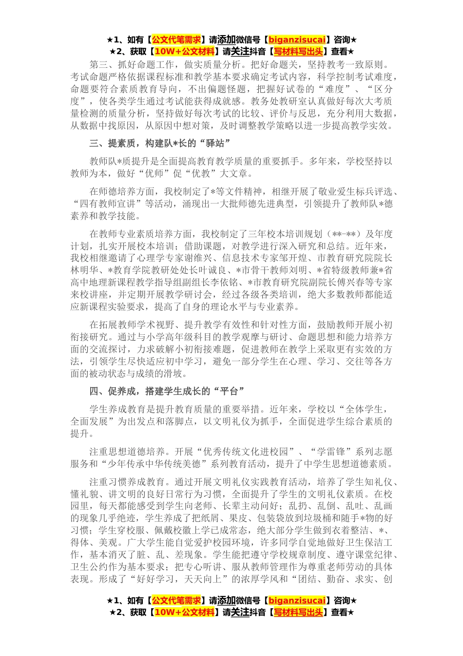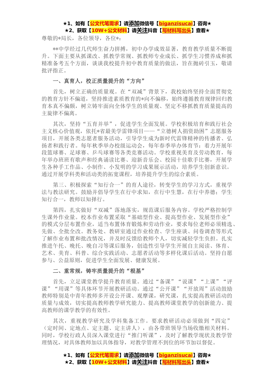 ★1、如有【公文代笔需求】请添加微信号【biganzisucai】咨询★★2、获取【10W+公文材料】请关注抖音【写材料写出头】查看★尊敬的*局长,各位领导,各位*:**中学经过几代师生奋力拼搏,初中办学成效显著,教育教学质量不断提升。下面主要从抓课改、抓教学常规、抓教师专业成长、抓学生习惯养成和抓精准备考五个方面,谈谈我校提升初中教育质量的做法,旨在抛砖引玉,敬请批评指正。一、真育人,校正质量提升的“方向”首先,树立正确的质量观。在“双减”背景下,我校始终坚持全面贯彻党的教育方针不偏道,坚持推进素质教育的*向不偏移,始终遵循教育规律回归教育本真不偏颇,树立铸牢面向全体学生的质量观、坚定不移抓教育质量提高的主旋律不偏离。其次,坚持“五育并举”,促进学生全面发展。学校积极培育和践...