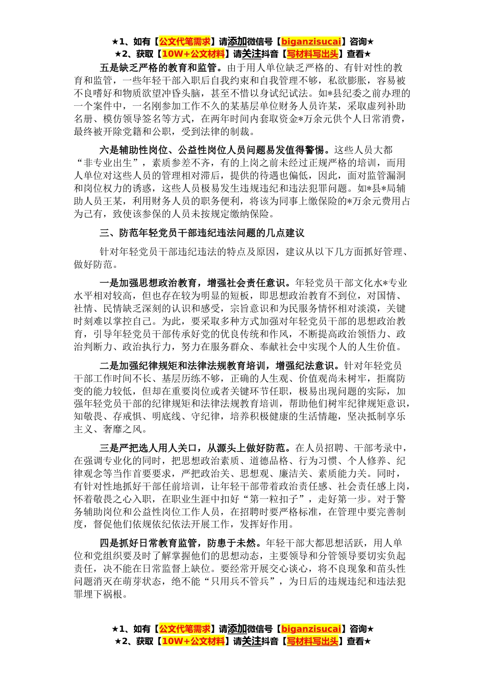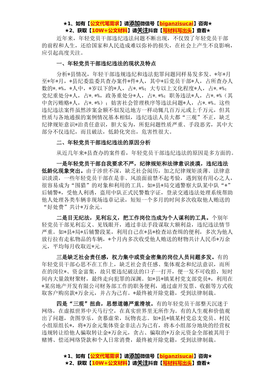 ★1、如有【公文代笔需求】请添加微信号【biganzisucai】咨询★★2、获取【10W+公文材料】请关注抖音【写材料写出头】查看★近年来,年轻党员干部违纪违法问题不断出现,不仅毁了年轻党员干部的前程和人生,还给国家和人民造成难以弥补的损失,在社会上产生不良影响,应引起高度关注。一、年轻党员干部违纪违法的现状及特点分析*县情况,年轻干部违规违纪和违法犯罪问题同样易发多发。*年*月至*年*月,*县纪委监委共查办案件*件*人,其中*后党员干部*人,占所查办人数的*.*%,*人中,*岁以下的*人,占*.*%;大专以上文化程度*人,占*.*%;党纪重处分*人,占*.*%,政务重处分*人,占*.*%;职务违法*人,占*.*%(其中贪污贿赂*人,占*.*%);妨害社会管理秩序等违法问题*人,占*.*%。这些违纪违法案件虽然涉案金额不...