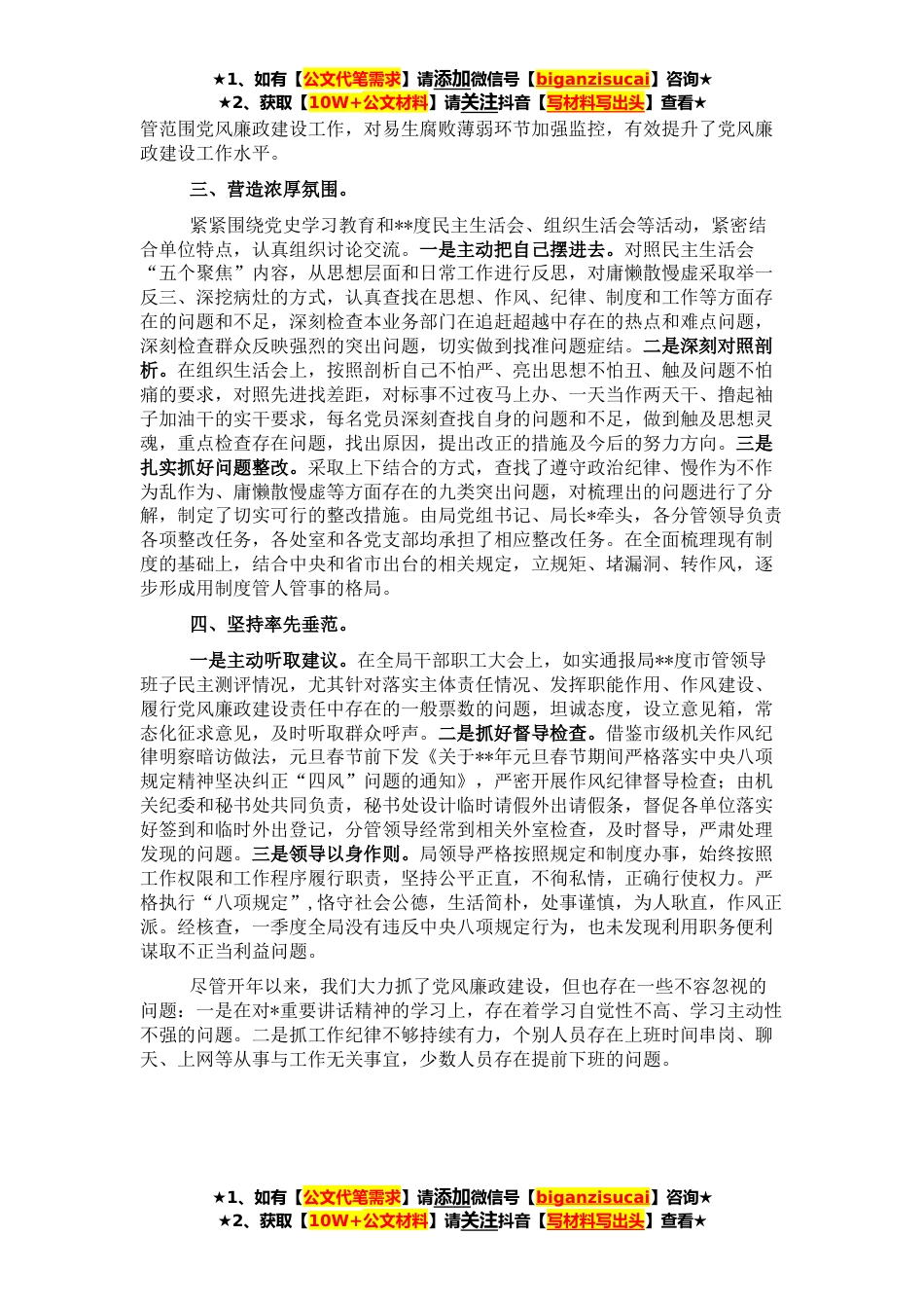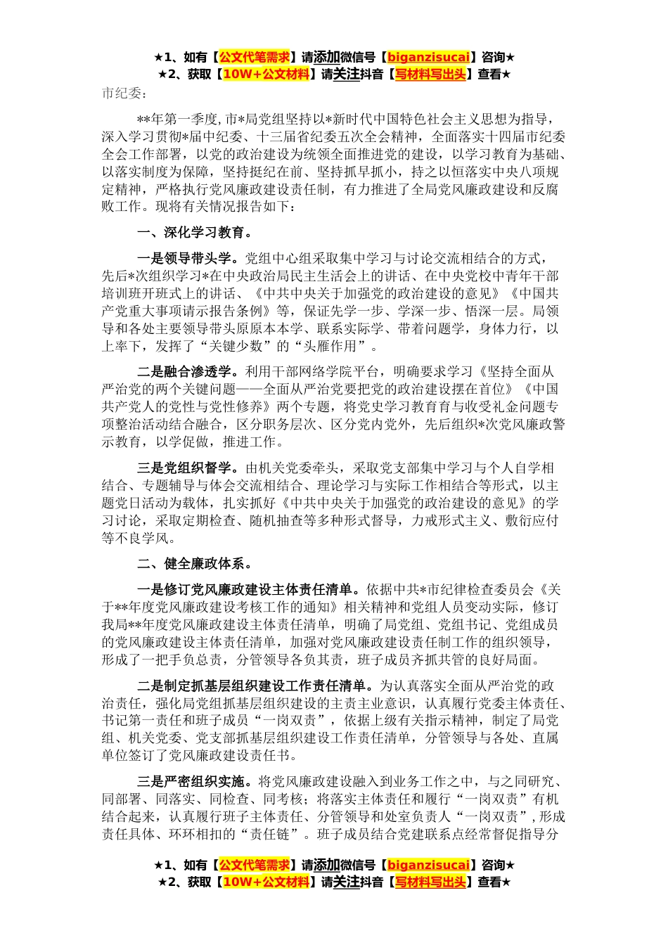 ★1、如有【公文代笔需求】请添加微信号【biganzisucai】咨询★★2、获取【10W+公文材料】请关注抖音【写材料写出头】查看★市纪委:**年第一季度,市*局党组坚持以*新时代中国特色社会主义思想为指导,深入学习贯彻*届中纪委、十三届省纪委五次全会精神,全面落实十四届市纪委全会工作部署,以党的政治建设为统领全面推进党的建设,以学习教育为基础、以落实制度为保障,坚持挺纪在前、坚持抓早抓小,持之以恒落实中央八项规定精神,严格执行党风廉政建设责任制,有力推进了全局党风廉政建设和反腐败工作。现将有关情况报告如下:一、深化学习教育。一是领导带头学。党组中心组采取集中学习与讨论交流相结合的方式,先后*次组织学习*在中央政治局民主生活会上的讲话、在中央党校中青年干部培训班开班式上的讲话、...